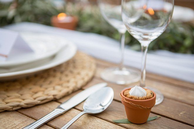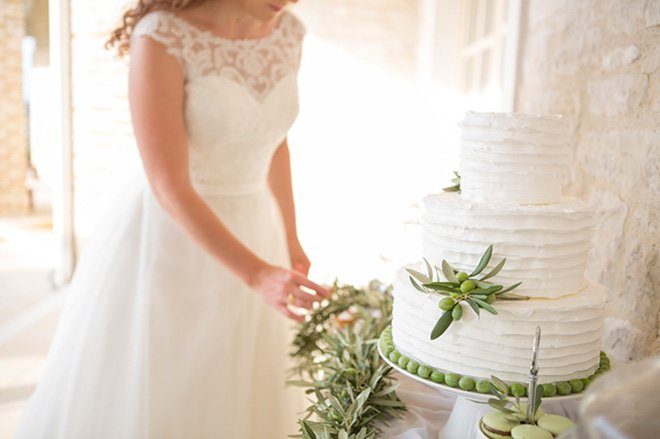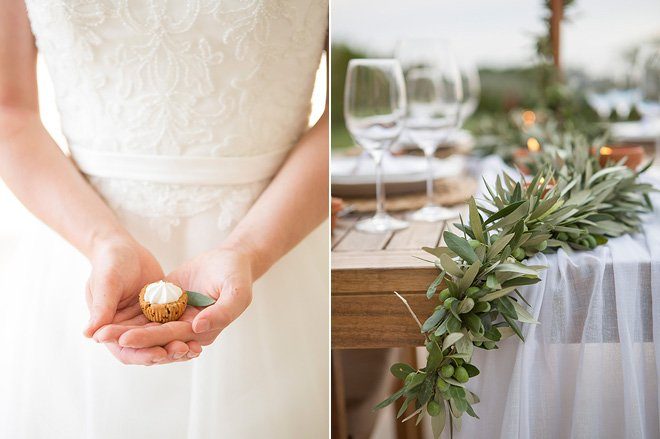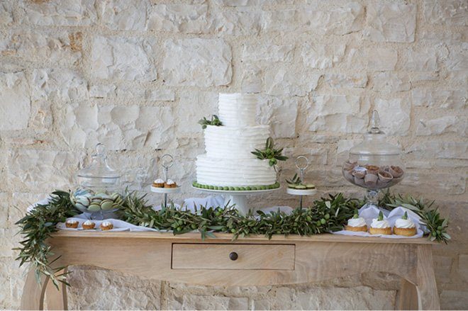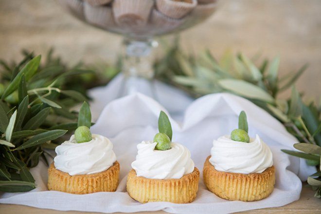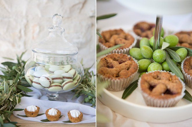 Was wäre ein Hochzeit ohne Torte und Süßigkeiten? Kleine Leckereien aus der Mc Box „Moser Cook ´n´ Cake Box wurden ebenfalls mit Olivenzweigen und kleinen, grünen Oliven dekoriert und kreierten so einen Sweet-Table, welcher sich perfekt in die übrige Deko einfügte. Transparente, weiße Tücher bildeten einen wunderbaren Kontrast zu der sonst eher erdigen und grünen Dekoration.