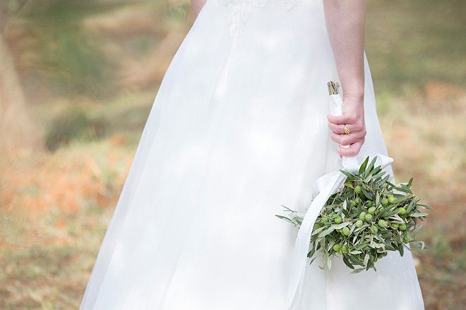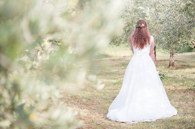 Die ungezähmte und raue der Natur trifft auf eine natürliche Braut, deren Haarpracht nur mit ein paar Olivenzweigen geschmückt wurde. Visagistin Andrea kümmerte sich um Haare und das Make-up: es ist natürlich, aber wunderschön. Das Brautkleid spielt mit feinen Stickereien am Oberteil, die dem schlichten Schnitt eine gute Portion Eleganz mitgeben.