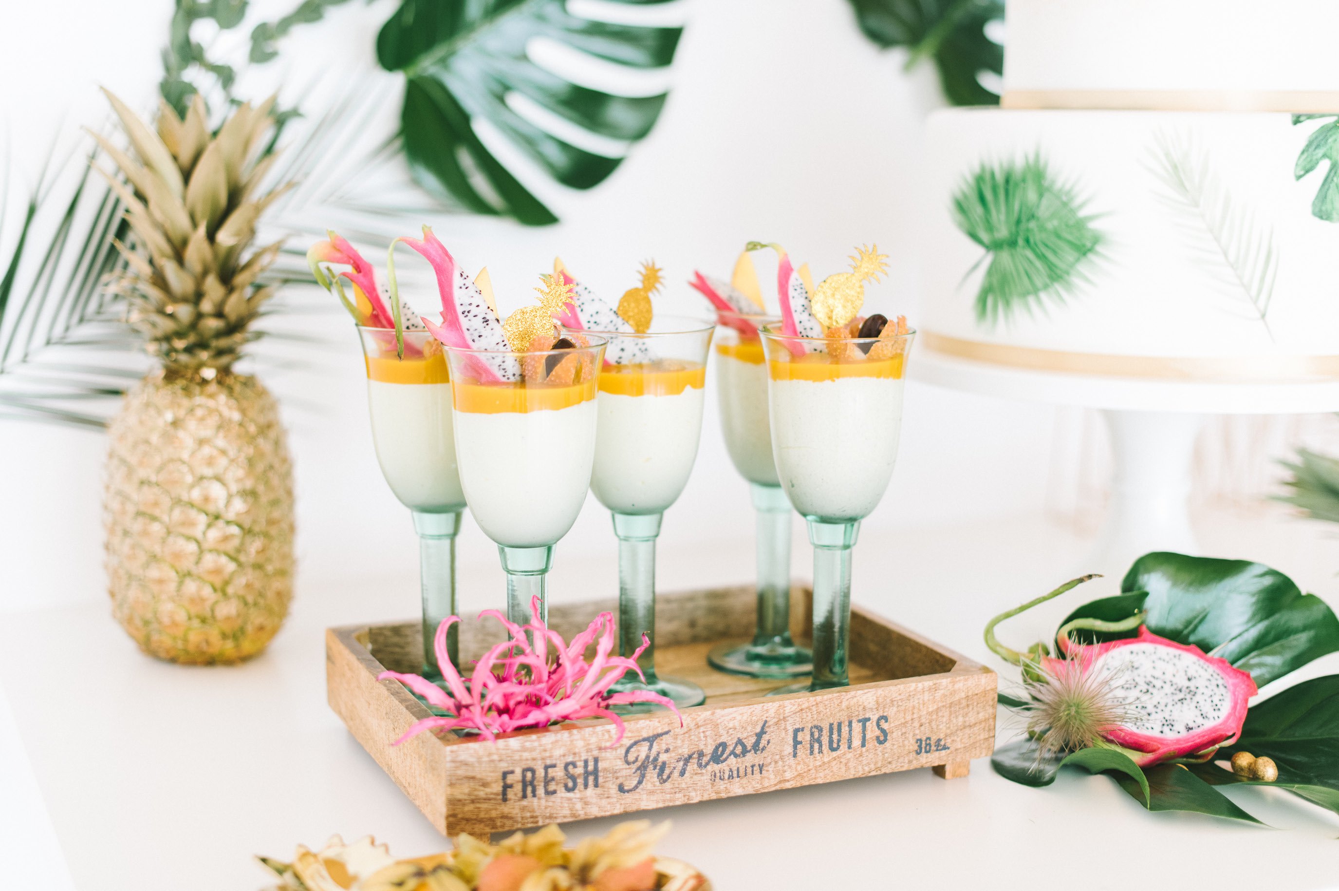 Prunkstück in der Mitte war die dreistöckige Hochzeitstorte, die man auch gerne mit einer fruchtigen Füllung bestücken kann. Ein frischer Obstsalat in ausgehöhlten Hälften einer Miniananas erfrischen an heißen Sommertagen, wer es süßer mag, greift zu Cupcakes mit Kokostopping und Vanillecreme mit Mangomouse. Das selbst gemachte Eis mit essbaren Blüten wäre doch der perfekte Mitternachtssnack an einem warmen Abend! Yummie!