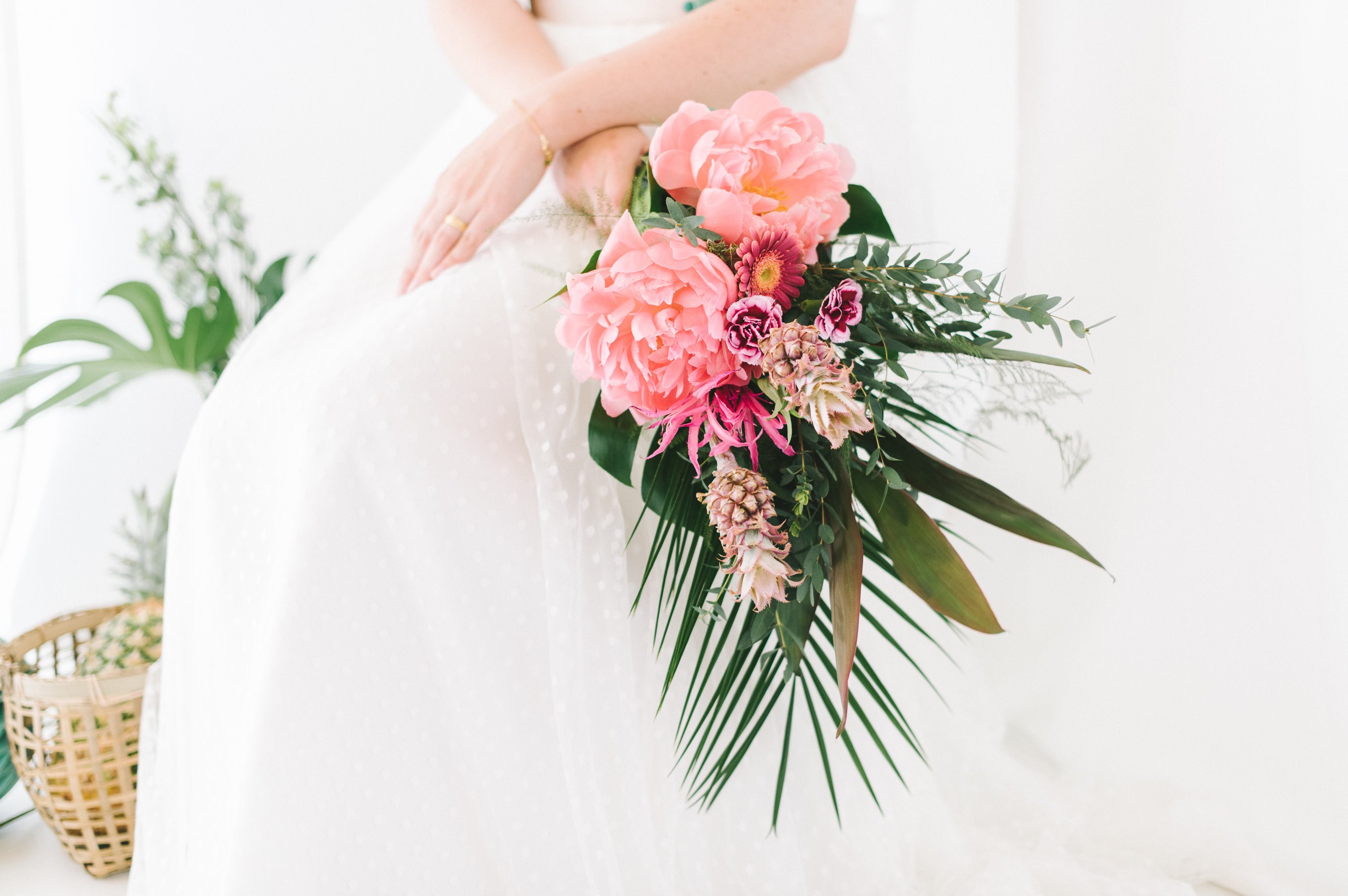 Den absolut grandiosen Brautstrauß müsst Ihr Euch anschauen. Die Kombi aus den pinken Pfingstrosen und den großen Blättern ist einfach der Knaller!
