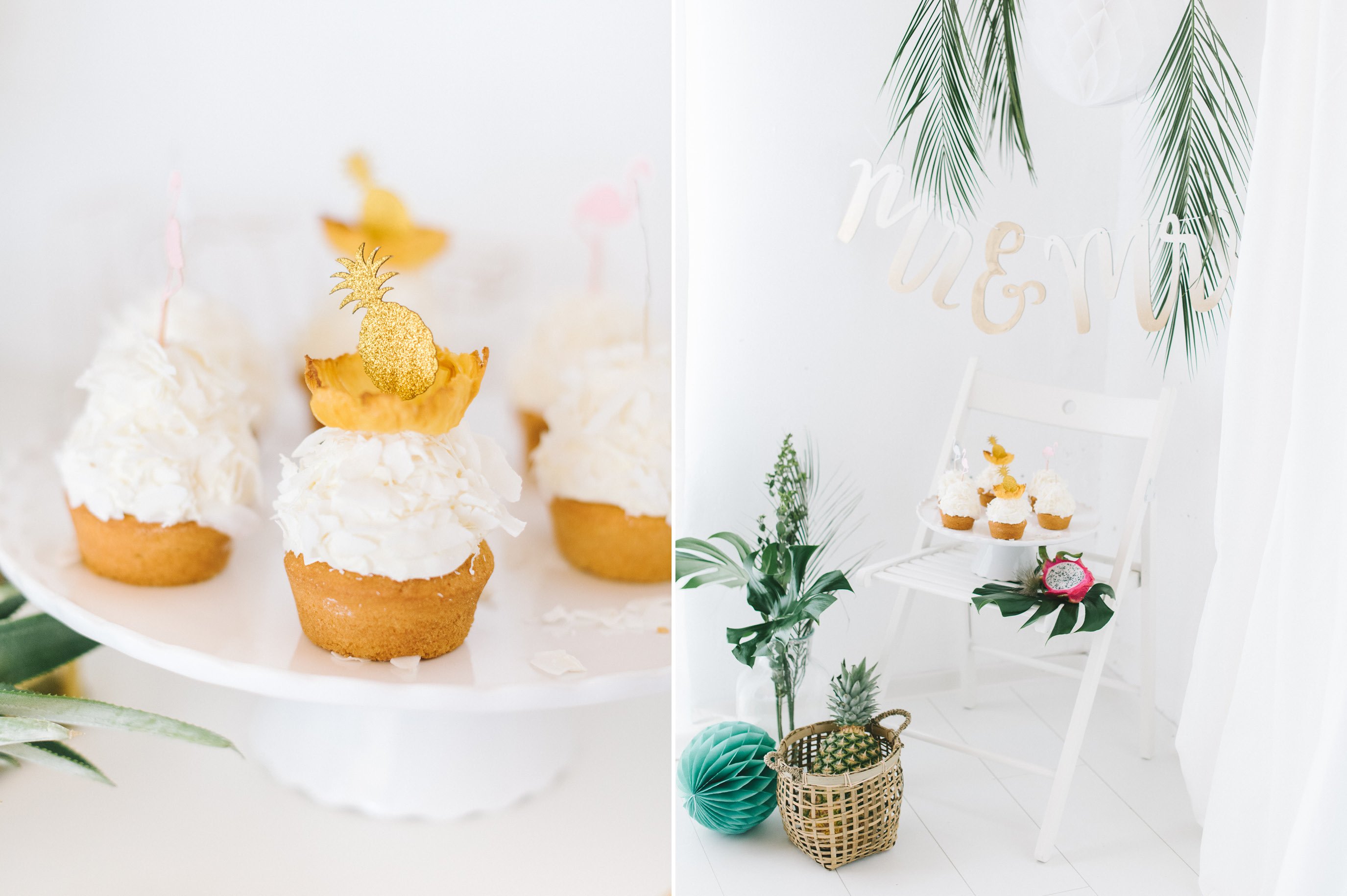 Die großen Blätter der Philodendren eignen sich ganz hervorragend als Platzteller! Schöner Hingucker. Zum goldenen Besteck gesellt sich eine kleine Papiertüte mit goldenen Streifen, die z.B. getrocknete Südfrüchte stecken könnte. Ananas kann man im Backofen recht einfach selbst trocknen, sie sieht auch auf Muffins ganz großartig aus, wie Ihr unten sehen könnt.