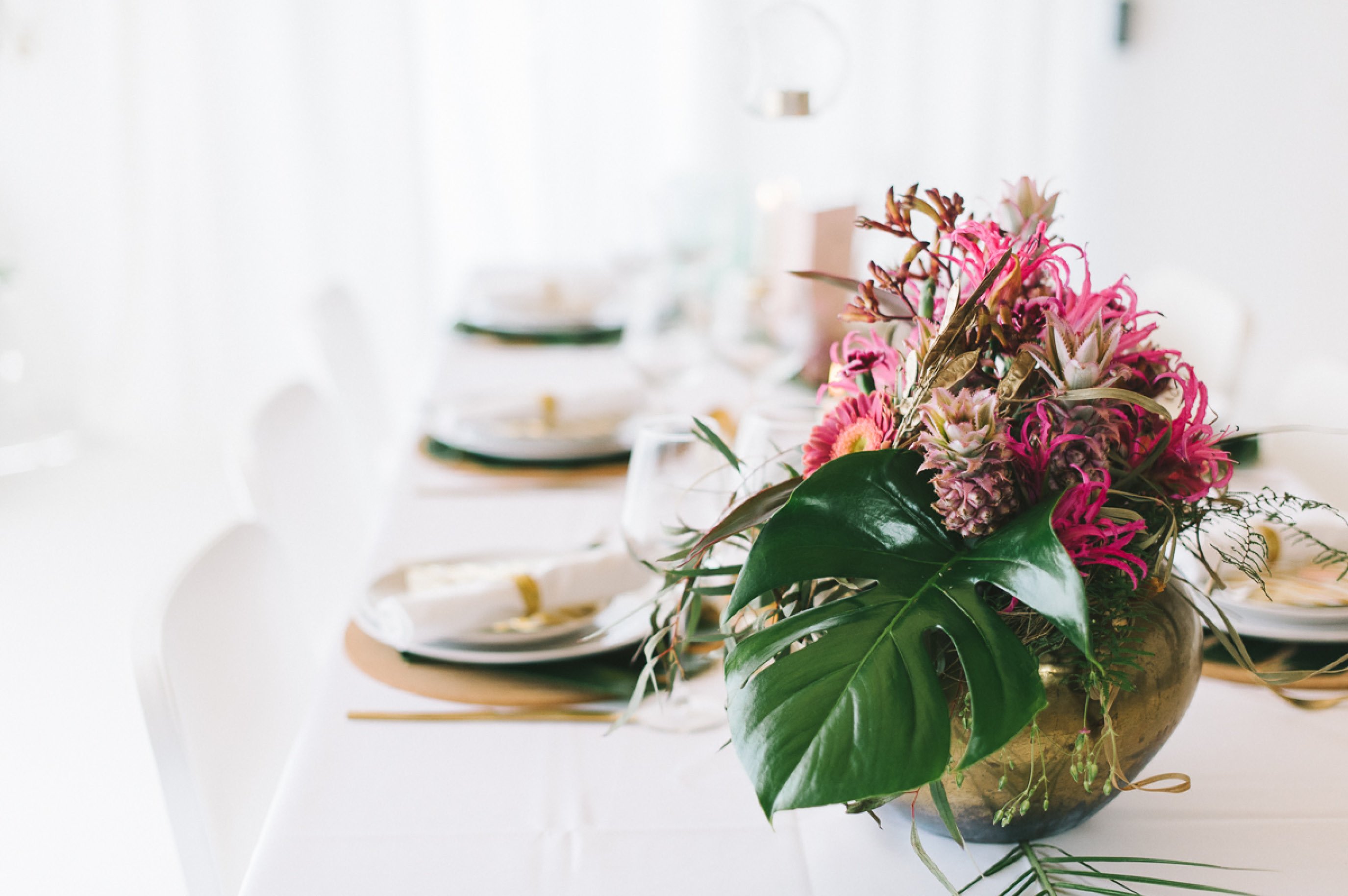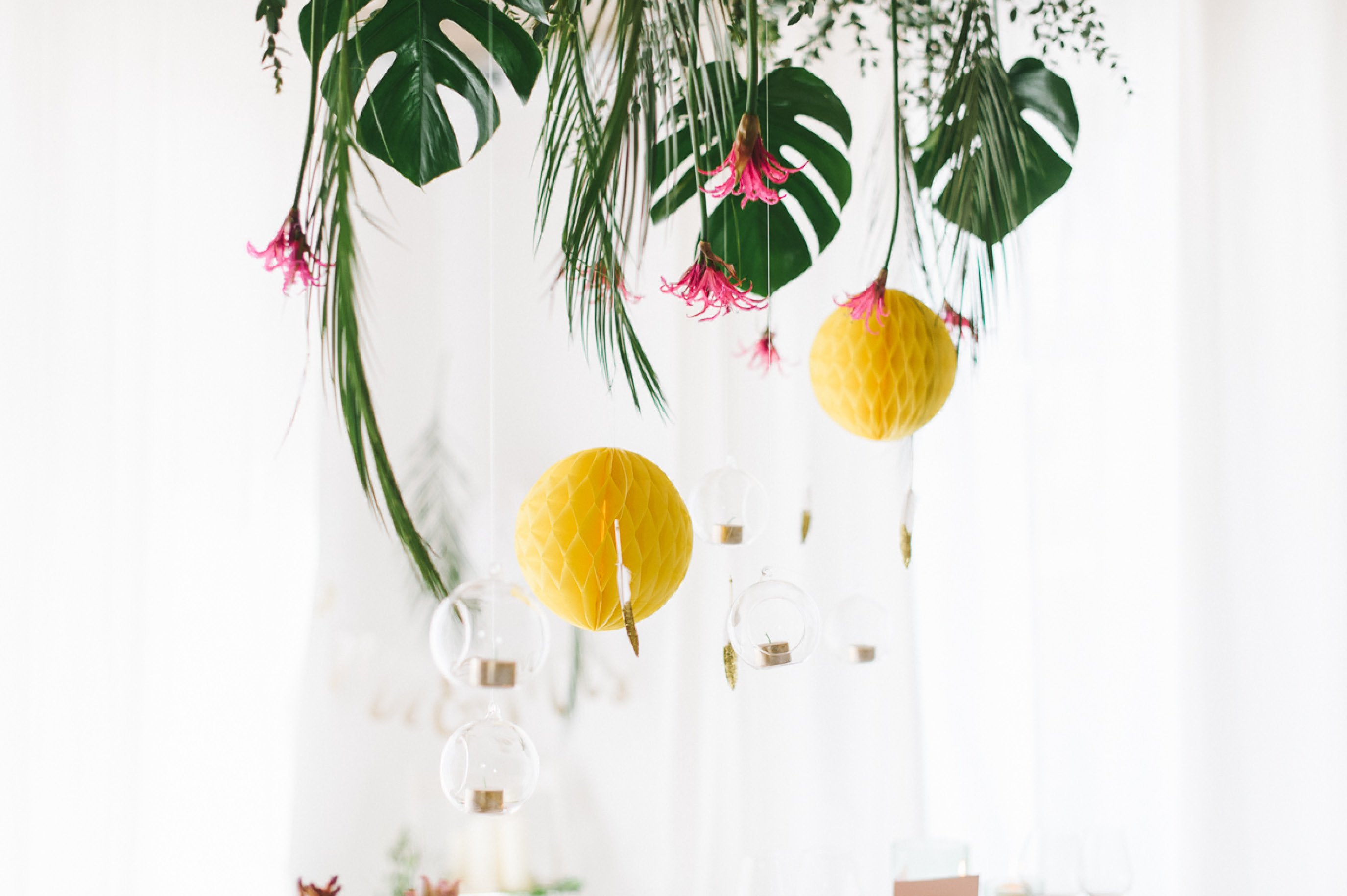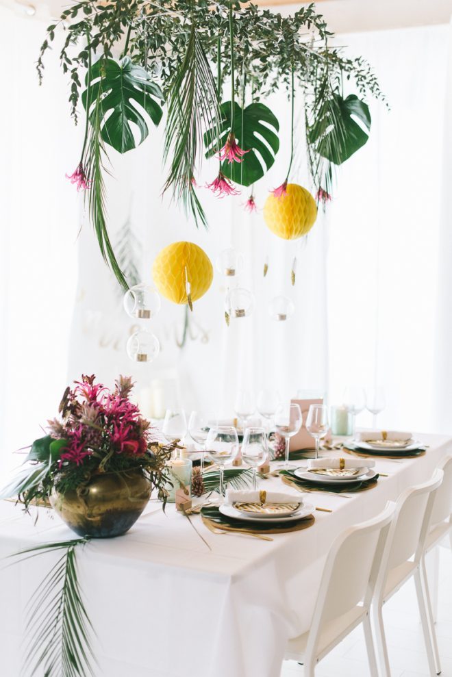 Wir nehmen Platz an einer lässig edlen Tafel, die mit golden Details überrascht und auf den ersten Blick durch die herab hängende Blätterdekoration überrascht. Quietschgelbe Wabenbälle tummeln sich mit kräftig pinken Blüten, feinen Glaskugeln mit Teelichtern und zarten Federn mit goldener Spitze.