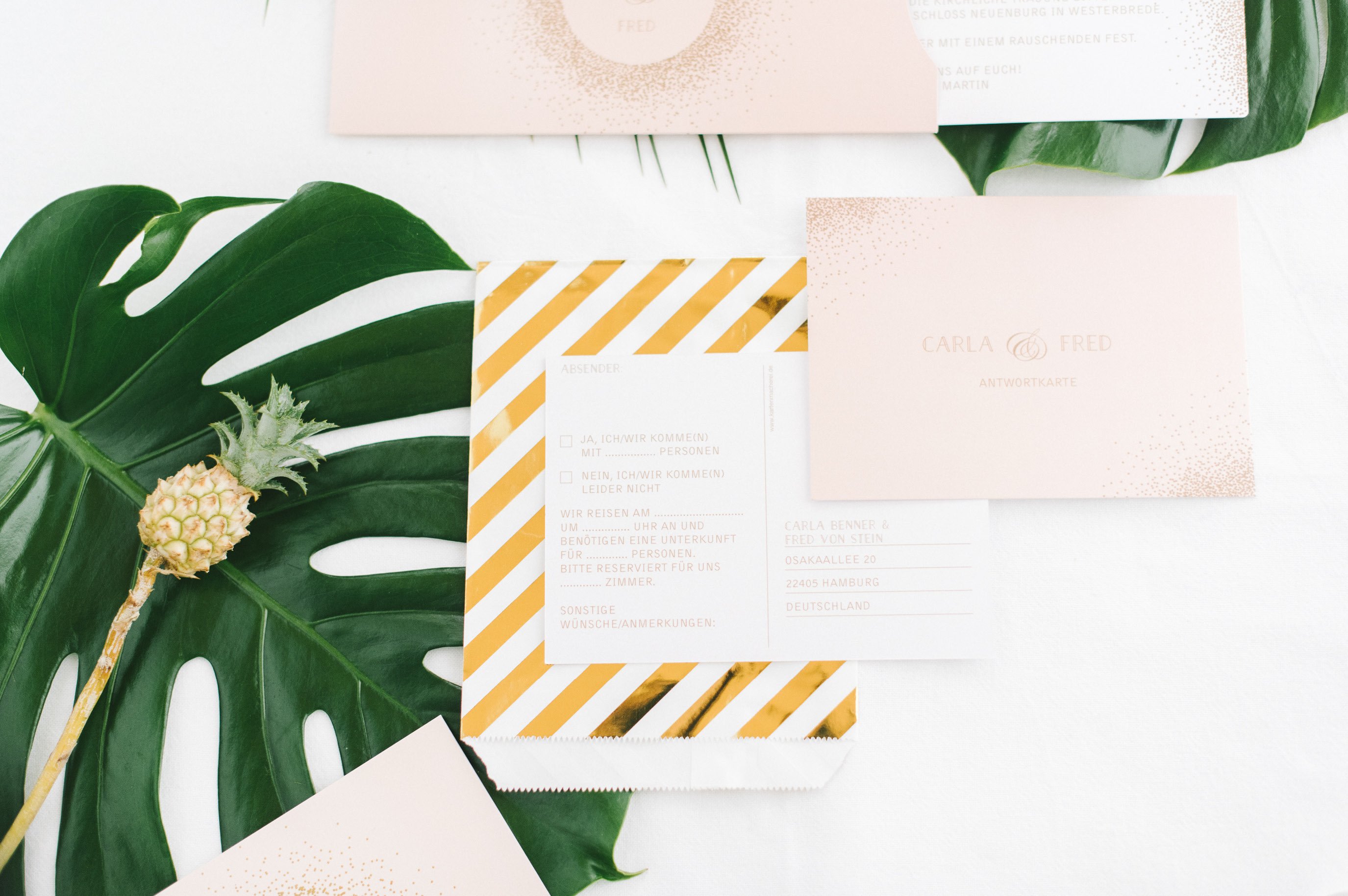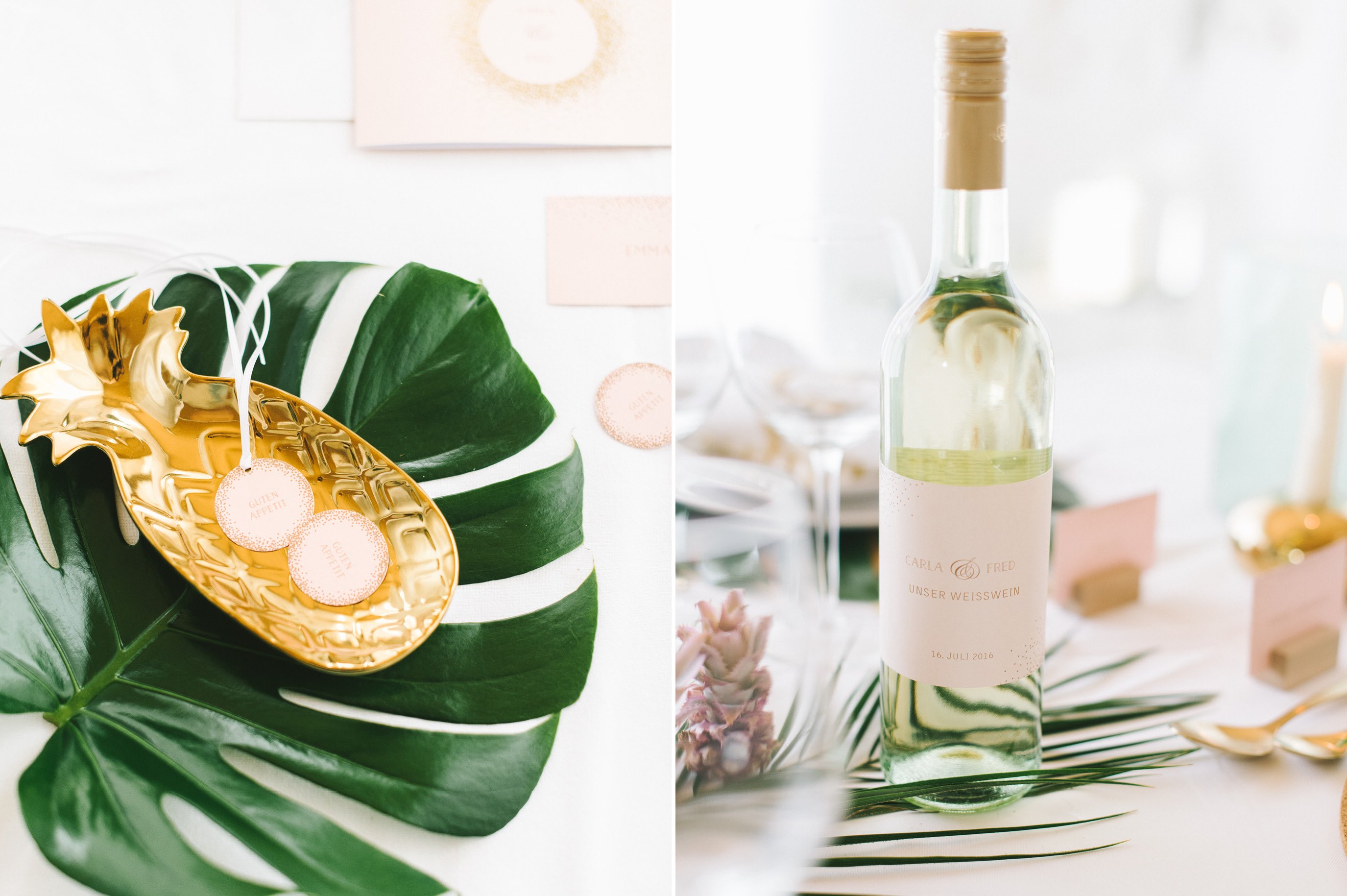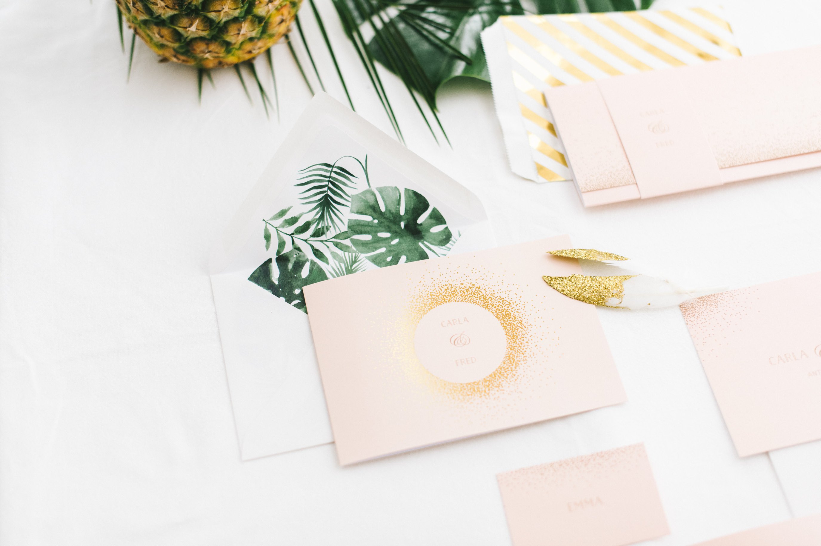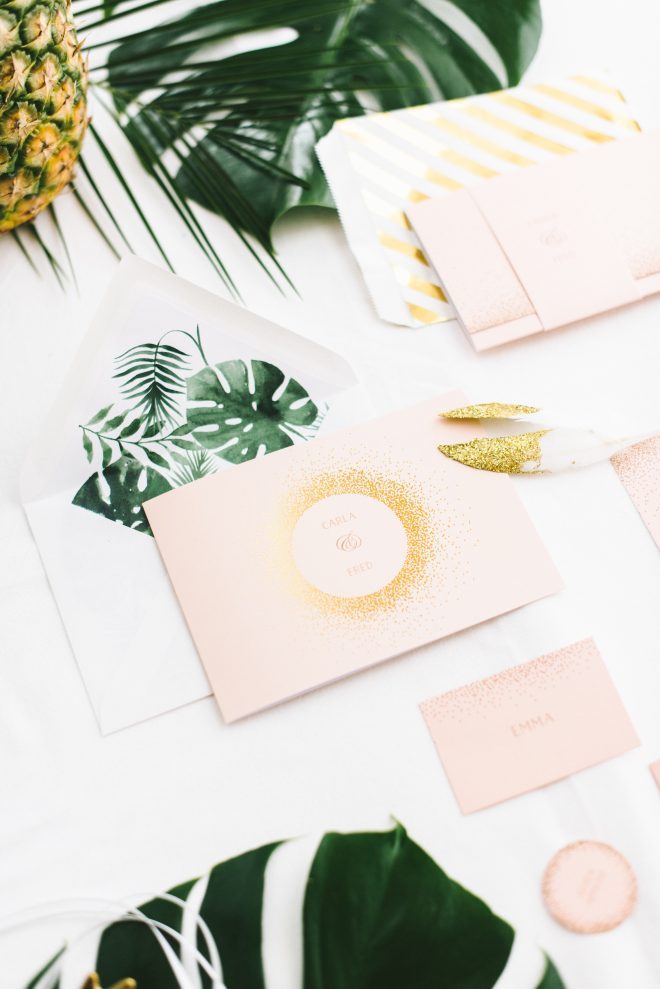 Die Papeterie ist, wie Euch vielleicht schon aufgefallen ist, keine, die ausschließlich zu dem tropischen Thema passt. Die Serie Glanzvoll Serie der Kartenmacherei ist wunderbar modern und bietet die Möglichkeit eine hochwertige Goldfolienprägung mit aufzubringen, wenn man es möchte. Auf der Einladung macht sich solch ein zarter Schimmer besonders gut. Um die Kosten im Griff zu haben, löst man es bei anderen Bestandteilen wie der Menükarte oder den Namenschildchen einfach über einen farbigen Druck.