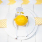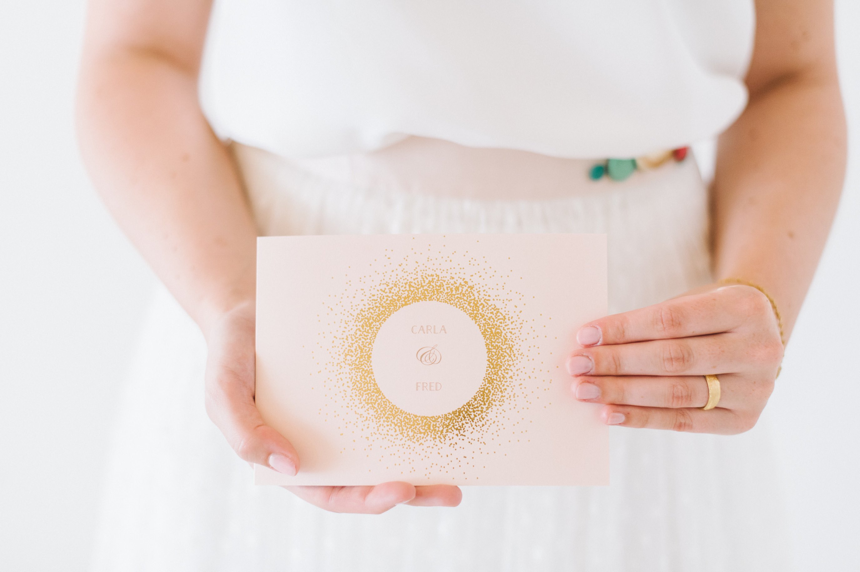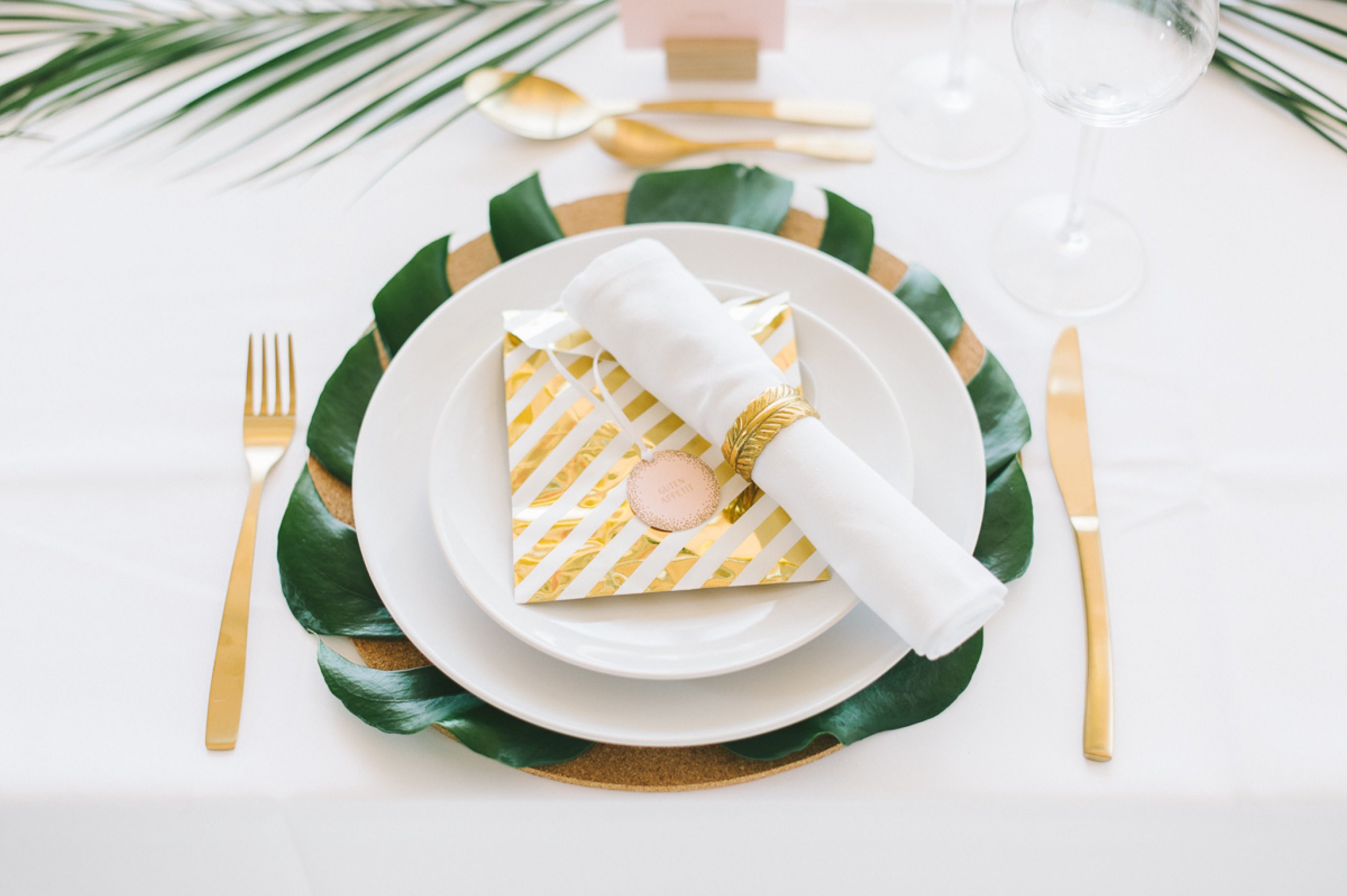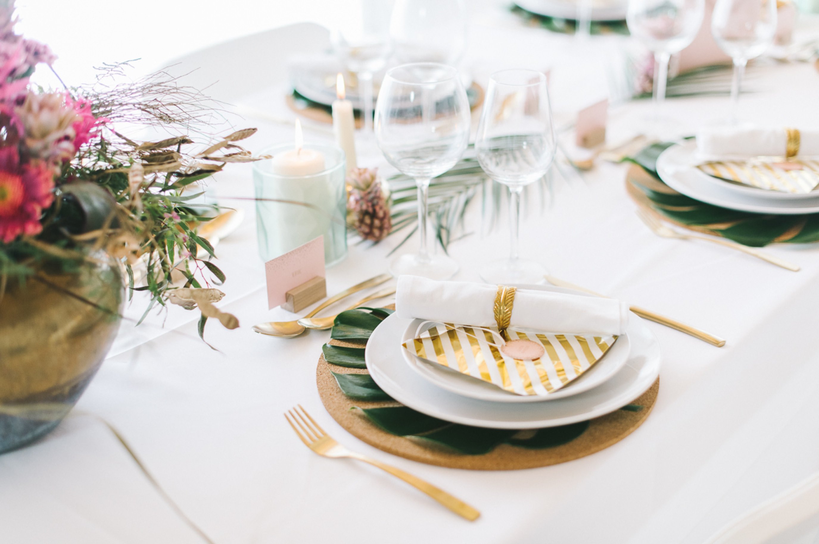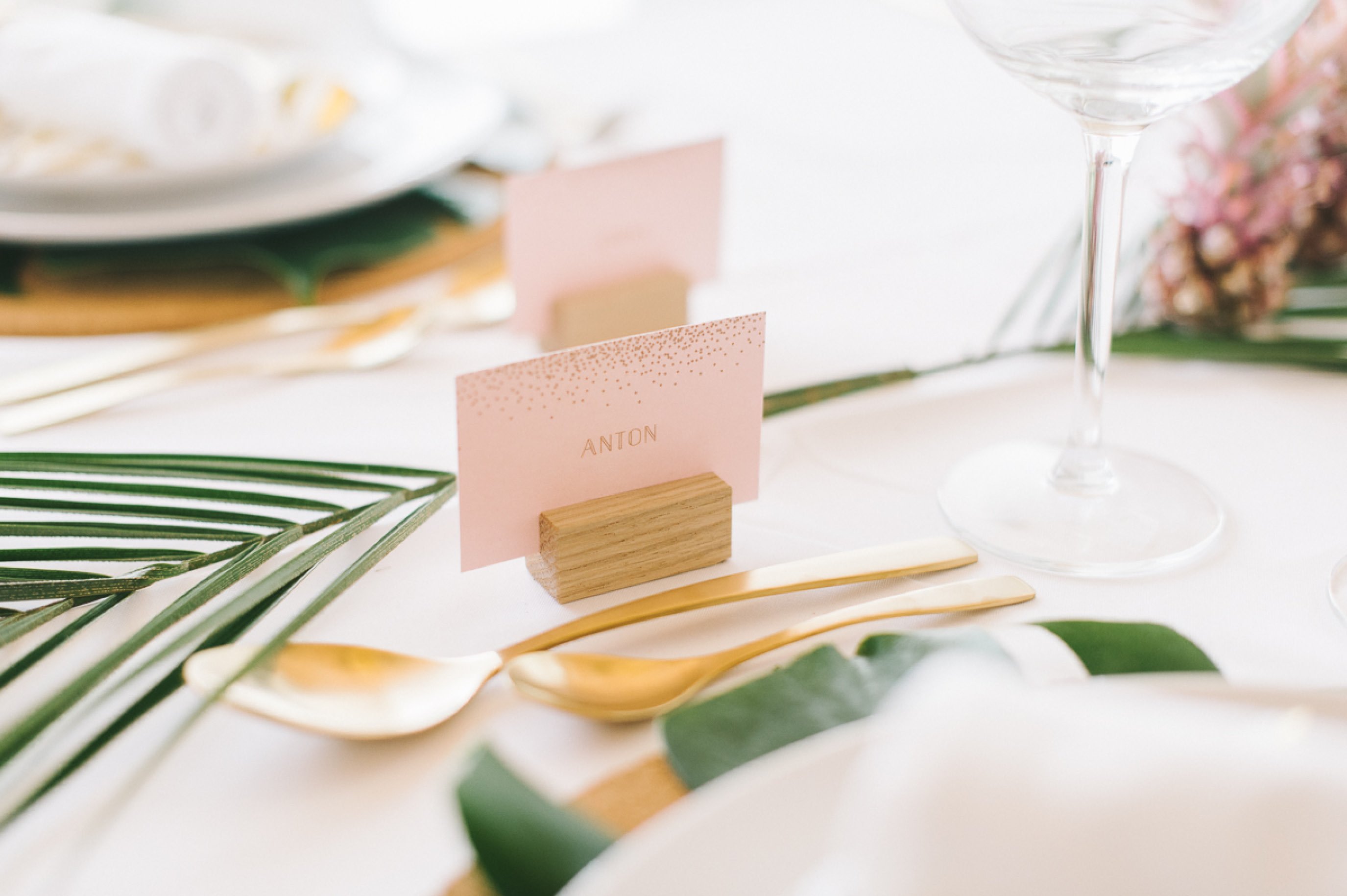 Die Papeterie ist, wie Euch vielleicht schon aufgefallen ist, keine, die ausschließlich zu dem tropischen Thema passt. Die Serie Glanzvoll Serie der Kartenmacherei ist wunderbar modern und bietet die Möglichkeit eine hochwertige Goldfolienprägung mit aufzubringen, wenn man es möchte. Auf der Einladung macht sich solch ein zarter Schimmer besonders gut. Um die Kosten im Griff zu haben, löst man es bei anderen Bestandteilen wie der Menükarte oder den Namenschildchen einfach über einen farbigen Druck.
