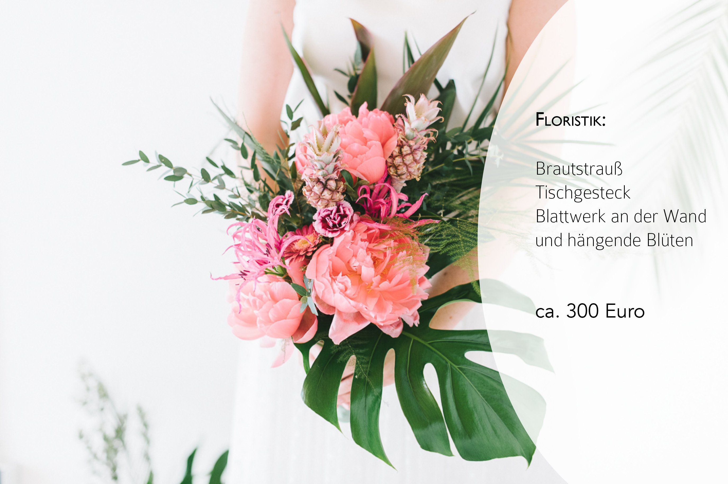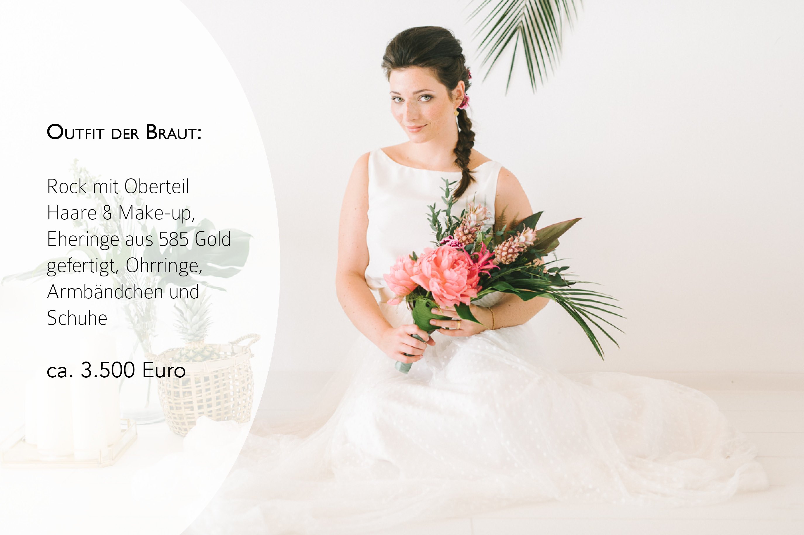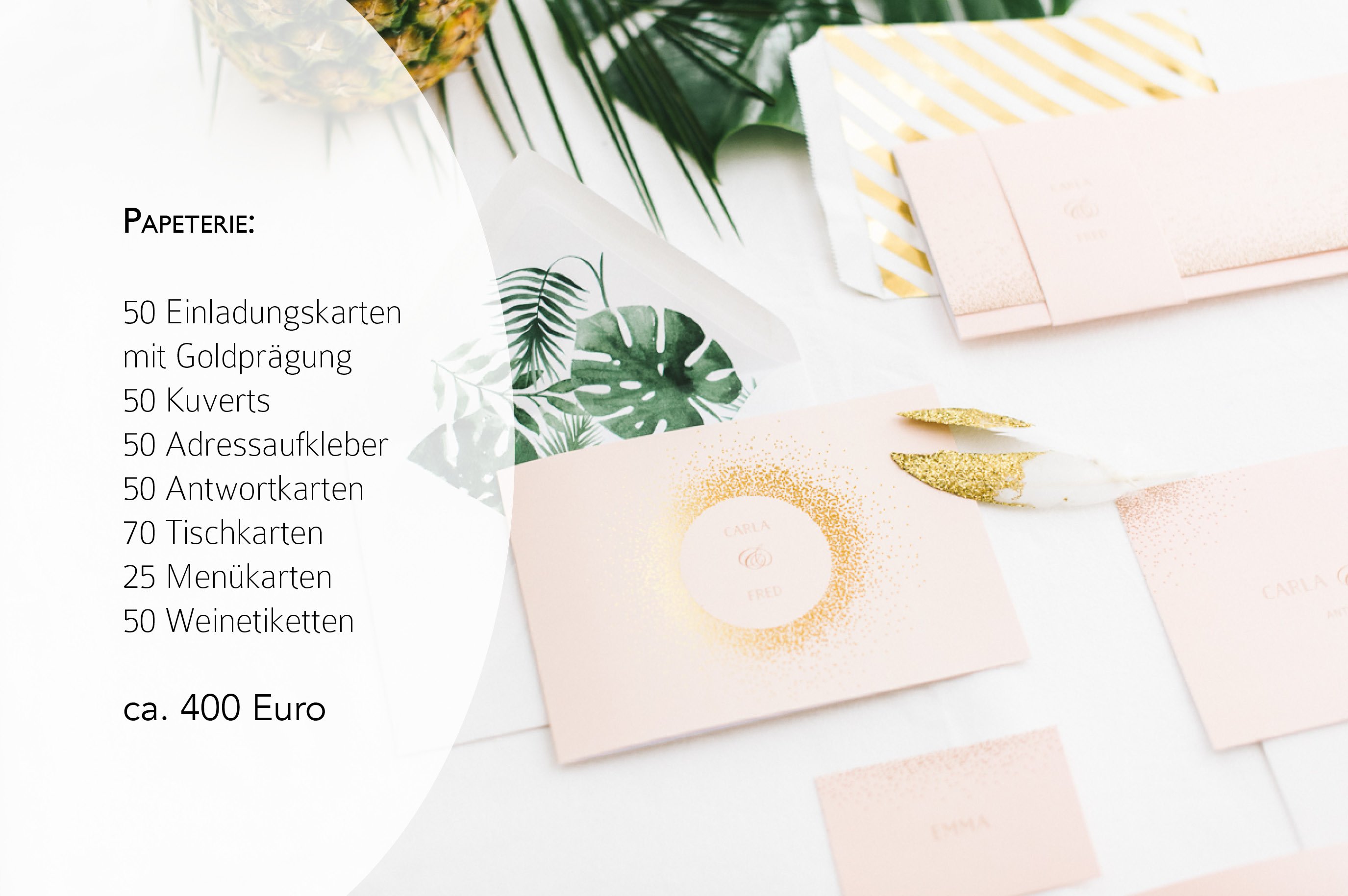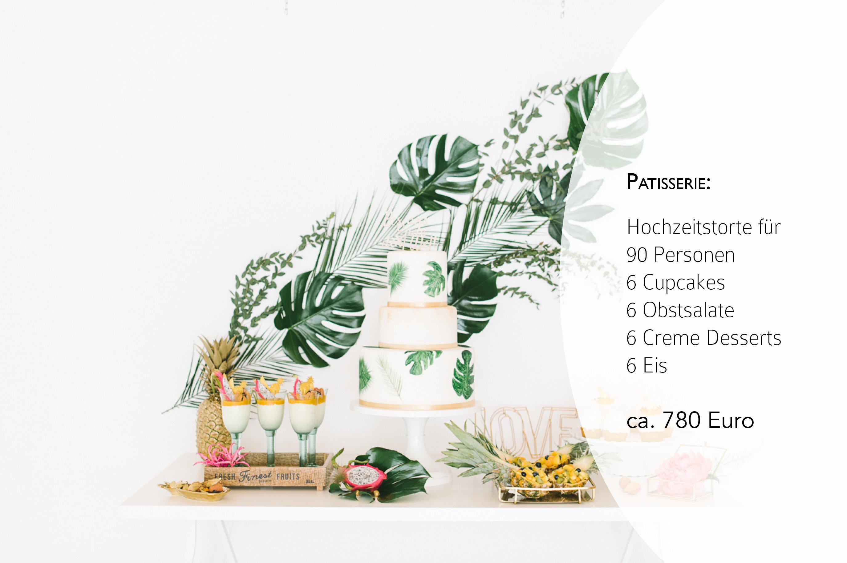 Von daher kommen hier die Preisangaben für das Outfit der Braut, die Papeterie, die Deko und die Patisserie.