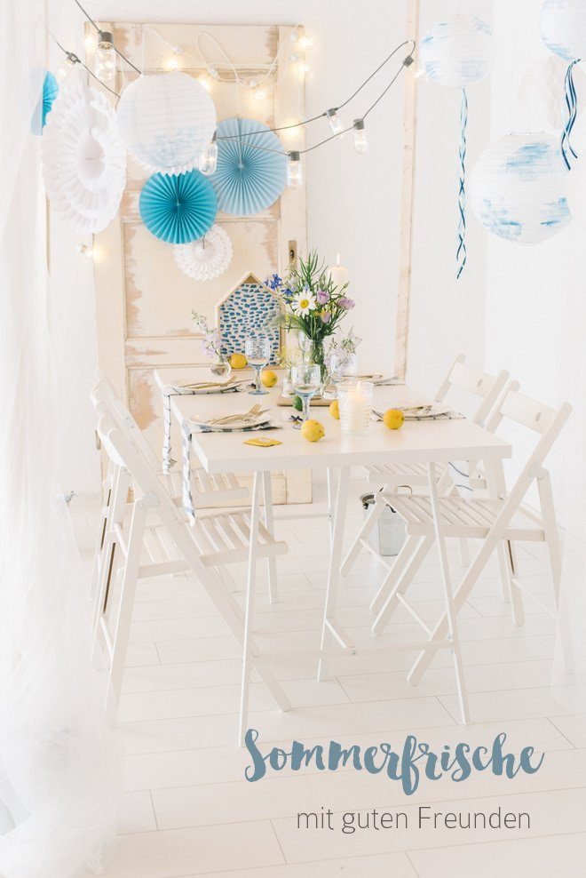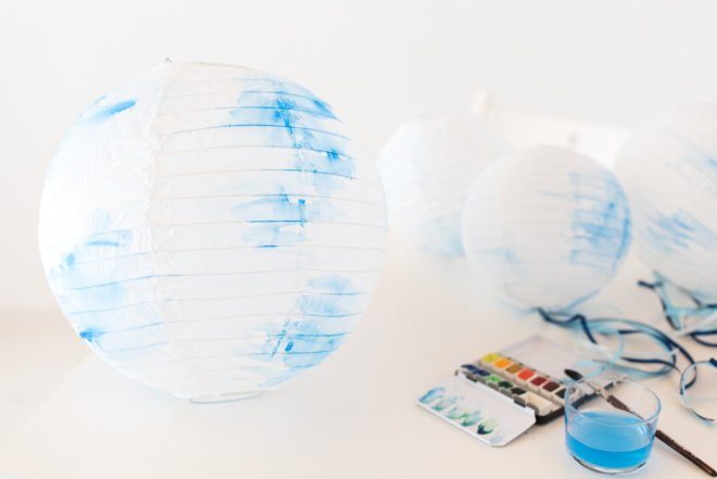 Das Prinzip ist denkbar einfach: schnappt Euch ein neutrales Objekt und pimpt es mit Euren Farben oder Materialien. Ich habe mir fünf weiße Papierlampions gegriffen, die zum im Stil der Dekoration passen sollen. Eine sommerlich leichte Party soll es werden. Blautöne wie das Meer an einem herrlichen Sommertag gehen ineinander über, ein bisschen Türkis kommt dazu und ein paar Tupfer Gelb von der Zitronenlimo ebenso. Fertig ist das Farbkonzept!