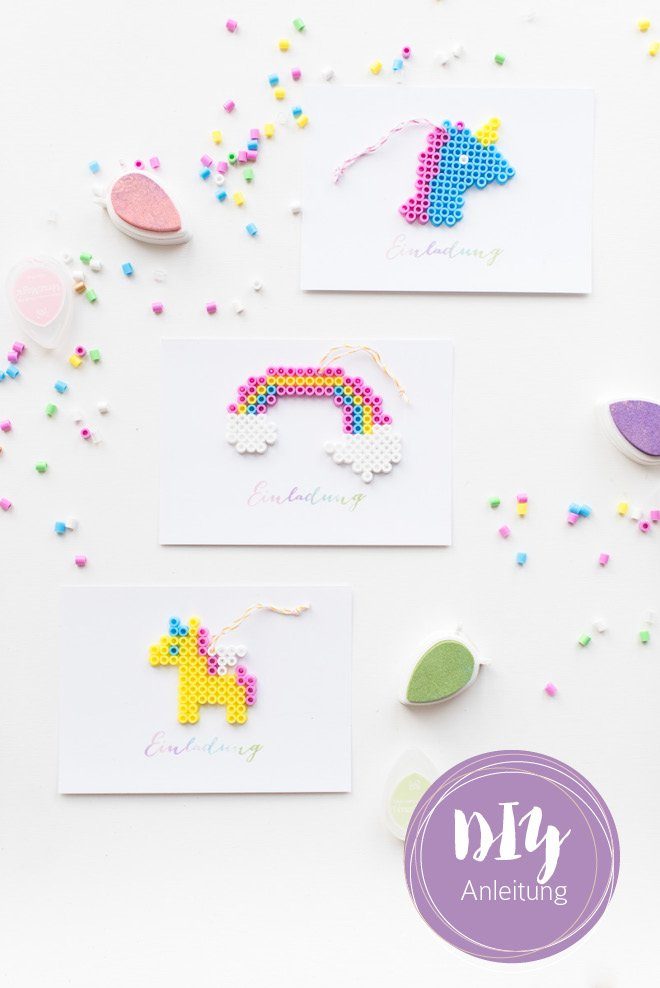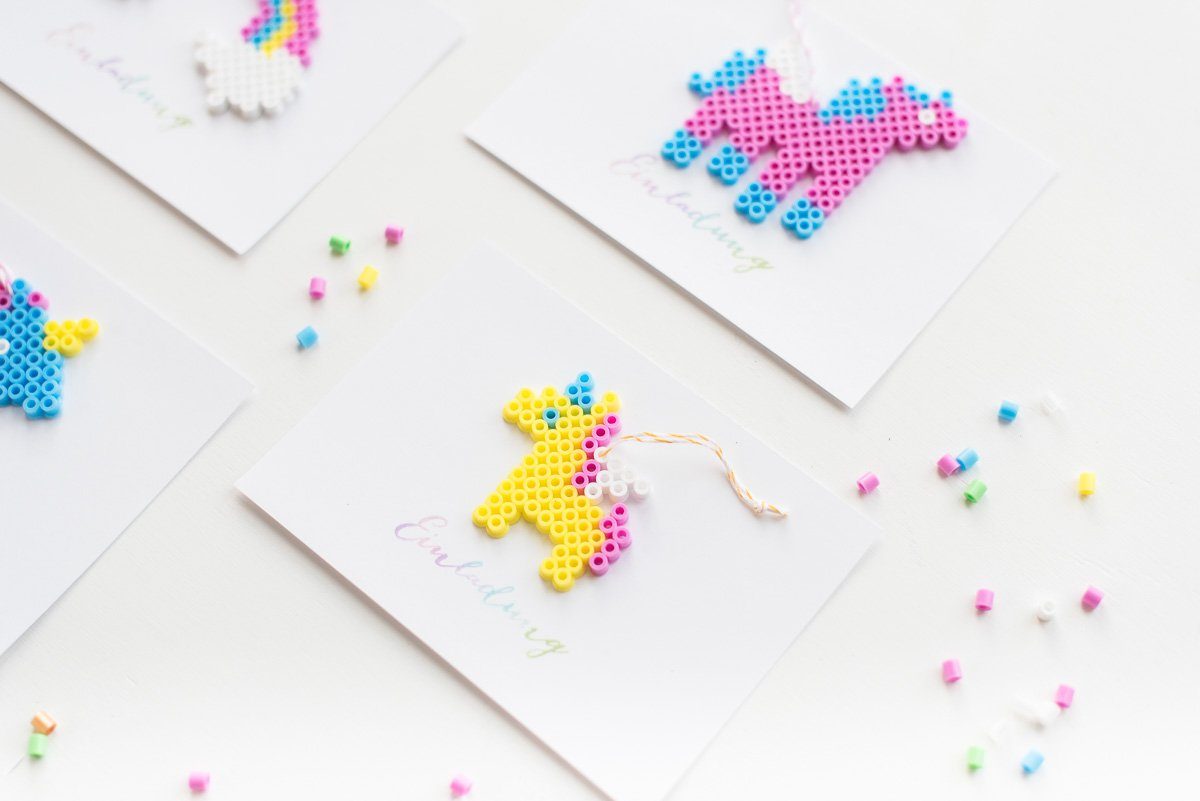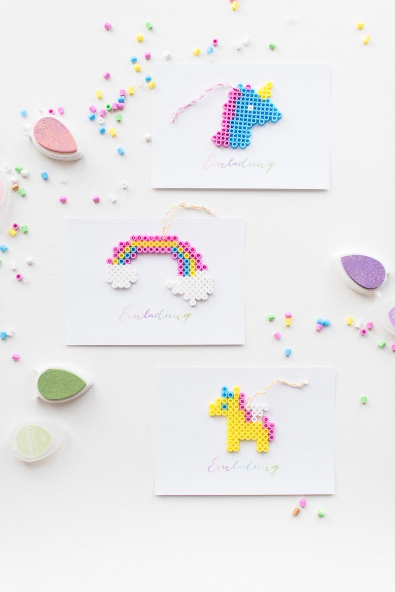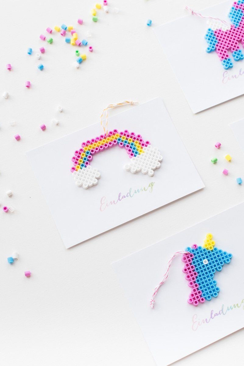 Aus den Bügelperlen habe ich drei Einhörner und einen Regenbogen gesteckt, die dann auf den Einladungen als Anhänger platziert waren und wie ein kleines Geschenk an die Gäste herüber kam.
