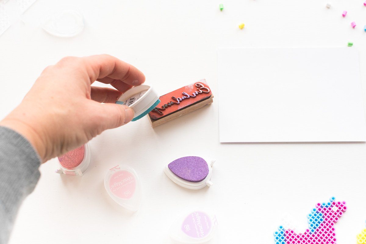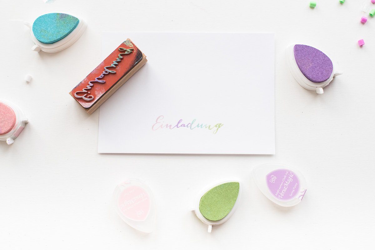 Sind die Figuren erst erstellt, geht es mit dem Papier weiter. Den Schriftzug ‘Einladung’ habe ich mit einem Stempel auf die Postkarten aufgebracht. Um den Regenbogen Look aufzugreifen, habe ich mit unterschiedlichen Farben auf dem Stempel gearbeitet.