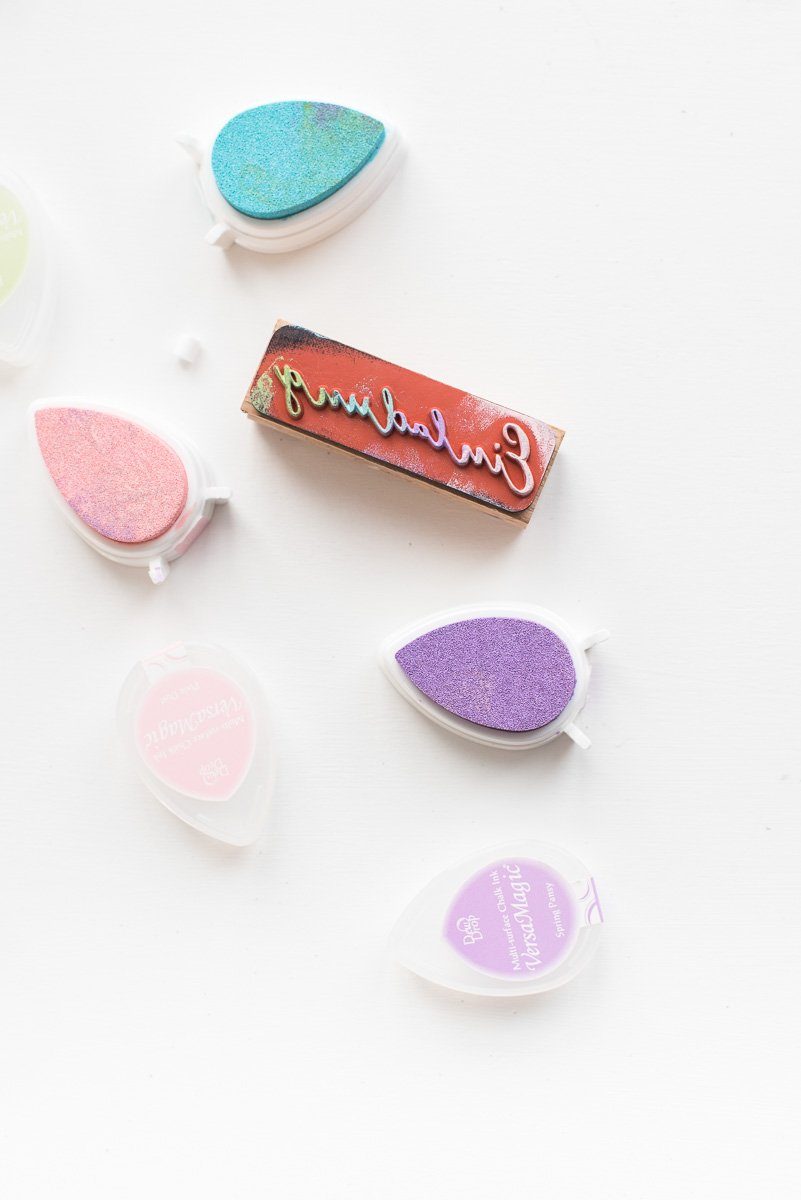 Der Trick hier ist, nicht den Stempel in die Farbe zu drücken sondern mit den kleinen Stempelkissen Farbe auf den Stempel zu tupfen. So lassen sich die Farben mit sanften Übergängen aufbringen.