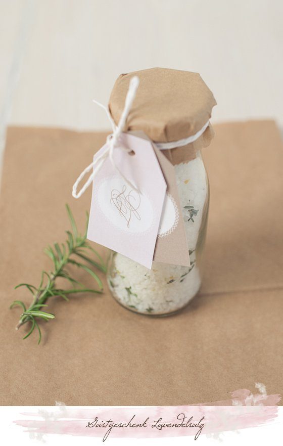 Und was man dazu braucht ist auch ganz einfach: Hübsche kleine Gläschen (gibt es beispielsweise in Hülle und Fülle bei http://glaeserundflaschen.de/), natürlich ein etwas hochwertigeres Meersalz, getrocknete Lavendelblüten (gibt es bspw. hier: http://www.natur-kraeuter.de) und wer mag kann nach belieben noch verschiedene Kräuter wie Koriander, Rosmarien und Chilli dazugeben. Die Gläschen selbstverständlich vorab reinigen. Das Salz mit den Kräutern vermischen und dann portionsweise in die Gläschen abfüllen. Wir haben je „Portion“ nur ca. 4% Lavendel beigemischt, da der Geschmack sonst leicht zu dominant wird. Im Anschluss werden die Gläschen dann selbstverständlich noch schön dekoriert und mit unserem Anhänger, den wir bei der Einladung schon hatten, versehen. Und fertig ist das Gastgeschenk. Dieses soll als zusätzlich Deko schon beim Eintreffen der Gäste an ihren jeweiligen Plätzen stehen. Und was meint ihr dazu? Wie sind Eure Ideen für die Gastgeschenke?