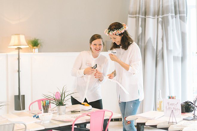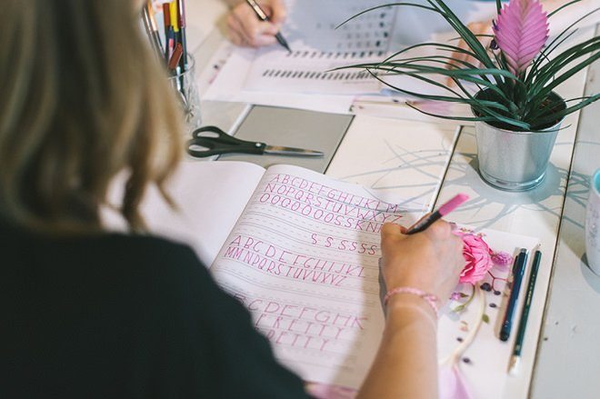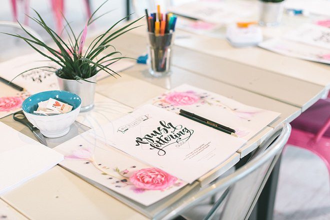 Der Vormittag gehörte ganz der Kunst des schönen Schreibens. Wobei Lettering eigentlich gar kein Schreiben ist, wie Tanja, alias Frau Hölle, direkt klar stellte. Es geht viel mehr um das Konstruieren der Buchstaben. Selbstverständlich mit einem lockeren Handgelenk und voller Elan. Bei den Druckbuchstaben war ich noch einigermaßen dabei. Doch schnell wurde klar, dass es unglaublich viel Übung braucht um beim Brush Lettering, d.h. dem Arbeiten mit einem pinselähnlichen Stift, elegante und formvollendete Buchstaben auf das Papier zu zaubern.