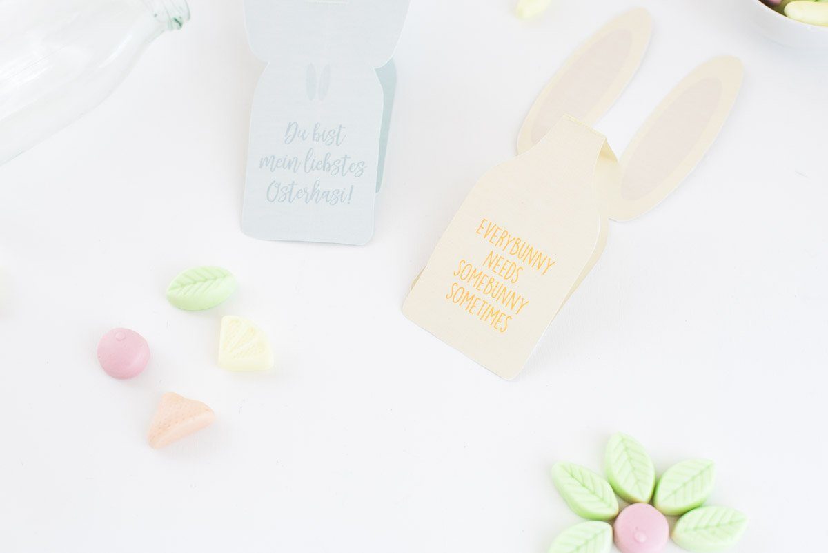 Die Flasche mit dem Deckel verschließen und die Bunny Ohren darauf stecken. Mit doppelseitigem Klebeband oder einem Punkt Heißkleber an der Flasche fixieren. Fertig!
