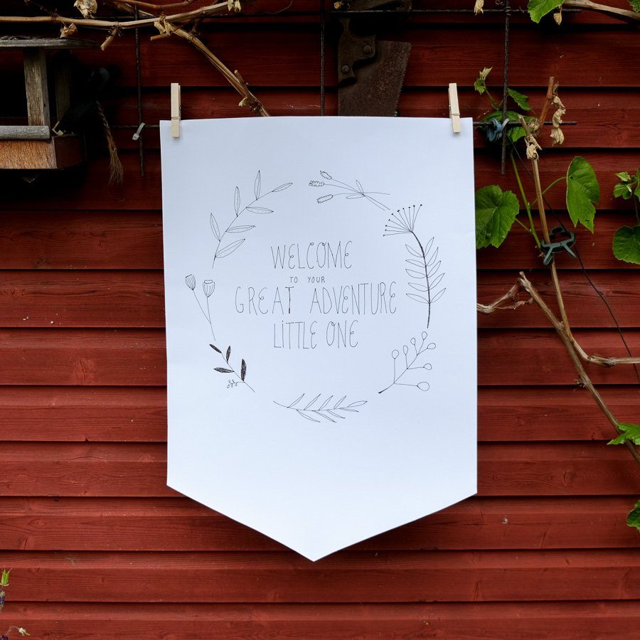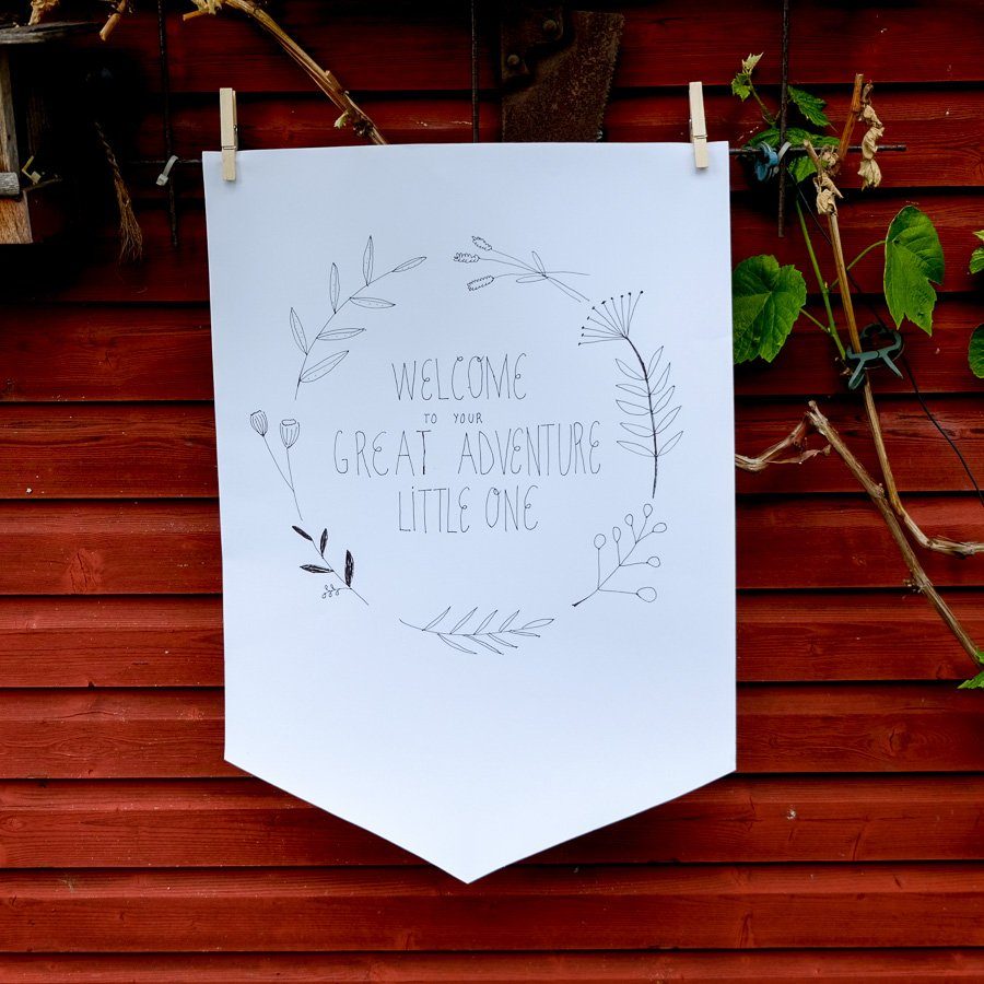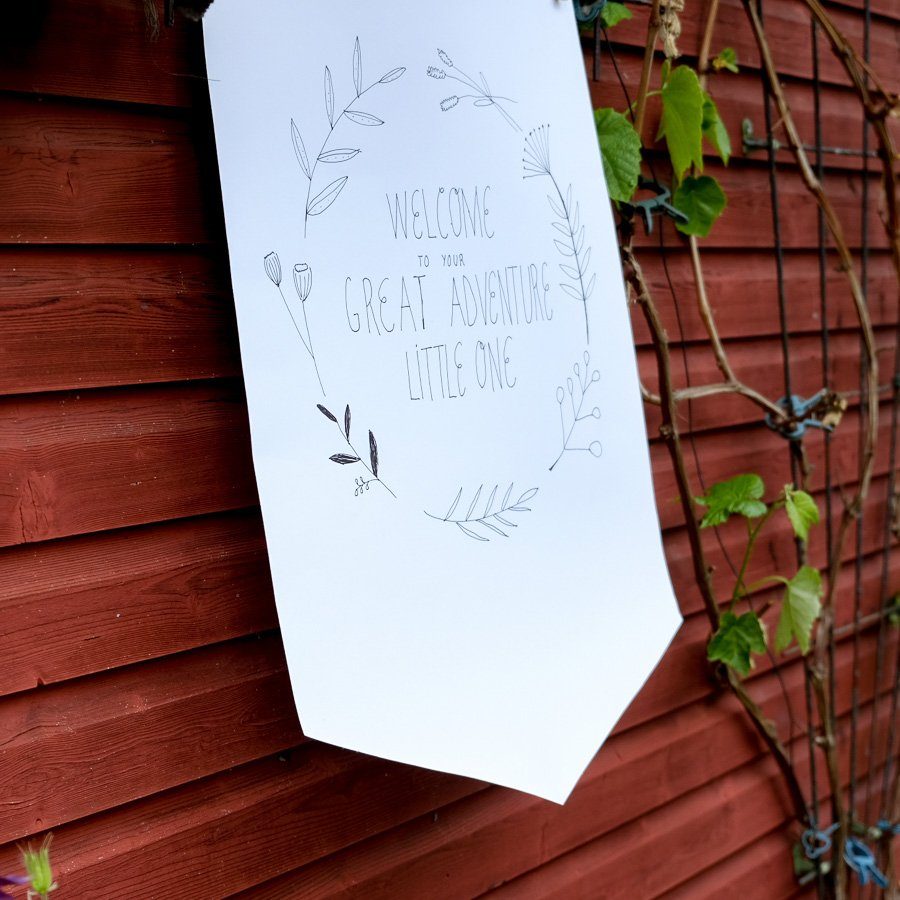 Mit Schere, Stift und Papier entwickelte Anni ein paar süße Dekostücke: Ein Welcome to the Adventure Banner, Geschenkanhänger und Dekostecker, die sowohl im Kuchen als auch in den Blumen eine gute Figur machten.