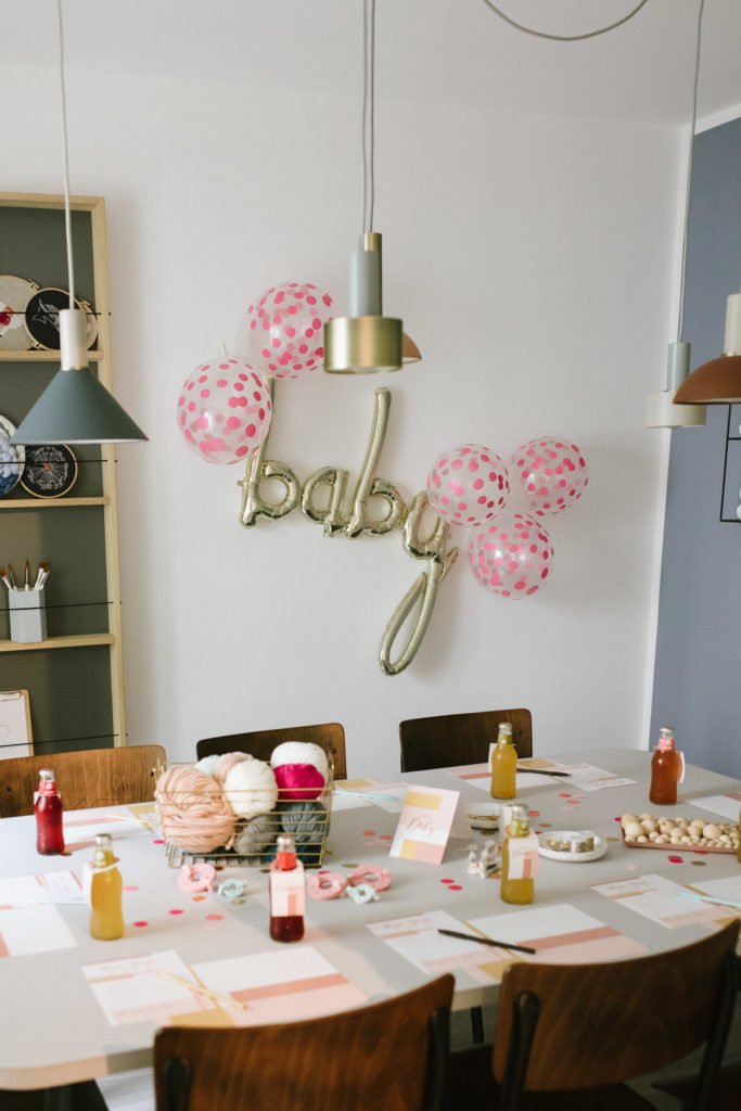 Die Fräulein K sagt Ja Babyparty Box kam bei der Baby Shower zum Einsatz! Tischsets, Flaschenanhänger, Wimpel und Caketopper sorgten für einen stimmigen Look. An der Wand hinter dem Arbeitstisch prangt ein goldener Baby Script Ballon. Umrahmt wird er von durchsichtigen Ballons mit pinkem Konfetti.