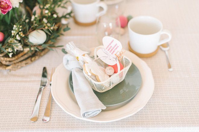 An den Plätzen der Gäste wartet schon ein süßes Kekshäschen mit ein paar farblich passenden Eiern im Körbchen. Kleine Geschenke mit etwas Selbstgemachtem erfreuen auch an Ostern die Gäste.