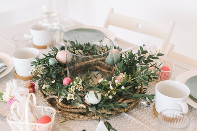 Das Arrangement an sich wäre schon ein Hingucker. Der Weidenkranz bietet den Schätzen einen passenden Rahmen und umarmt sie wie ein schützendes Nest. Um ihn ein bisschen frühlingshafter zu gestalten, habe ich kleinere Eukalyptuszweige und kleinere Verästlungen der Waxflower eingesteckt.
