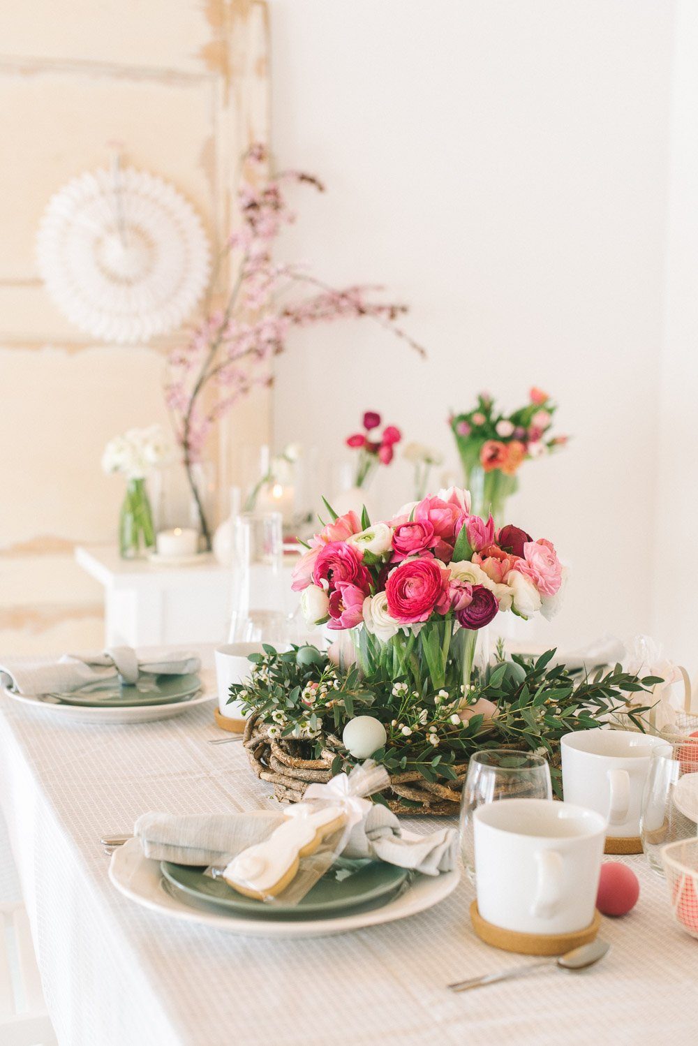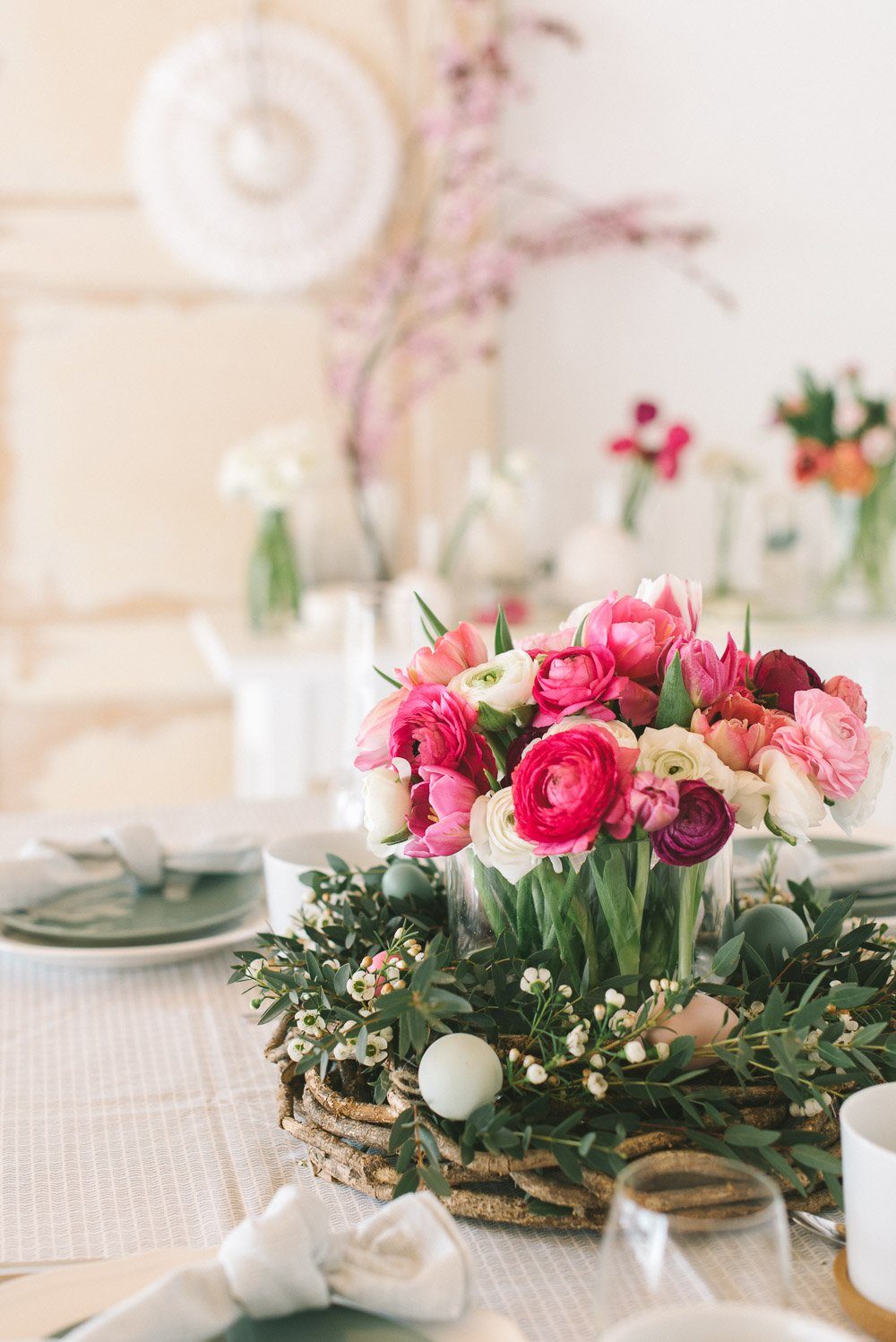 Wir holen uns heute den Frühling auf den Tisch, denn dieses Blumengesteck im Weidenkranz sorgt für ordentlich gute Laune am Ostertisch und lässt sich auch kinderleicht selbst herstellen. Blume2000.de hat mir eine üppige Lieferung an frischen Tulpen, Ranunkeln, Wachsblumen und Eukalyptus zukommen lassen. Dazu ein Weidenkranz und fertig war die Spielwiese.