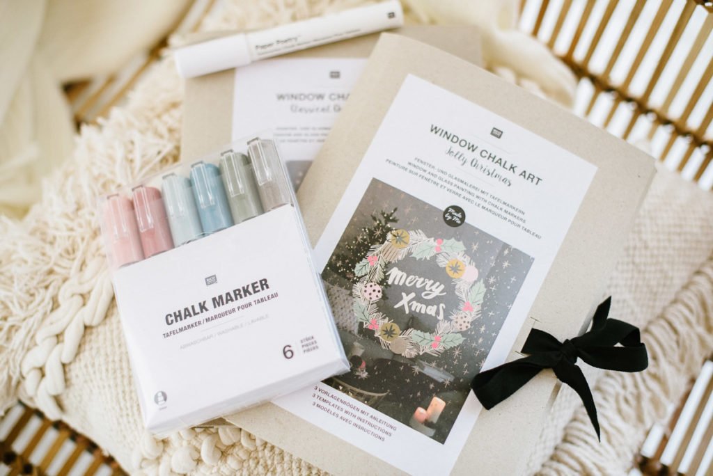 Alle Materialien für das DIY: Weihnachtliches Fensterbild mit Kreidestiften habt ihr mit den Tafelmarker und den Vorlagen aus unseren Vorlagensets zusammen.