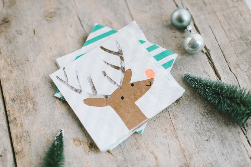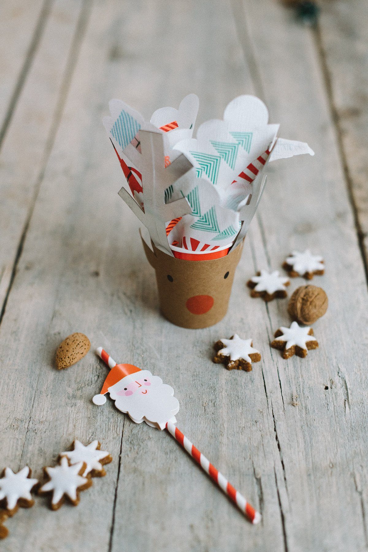 Die Becher aufstellen und die Rentierummantelung fest leben. Die Servietten auseinander falten und mit der Mitte in den Becher schieben, so dass die Ränder oen offen stehen bleiben.