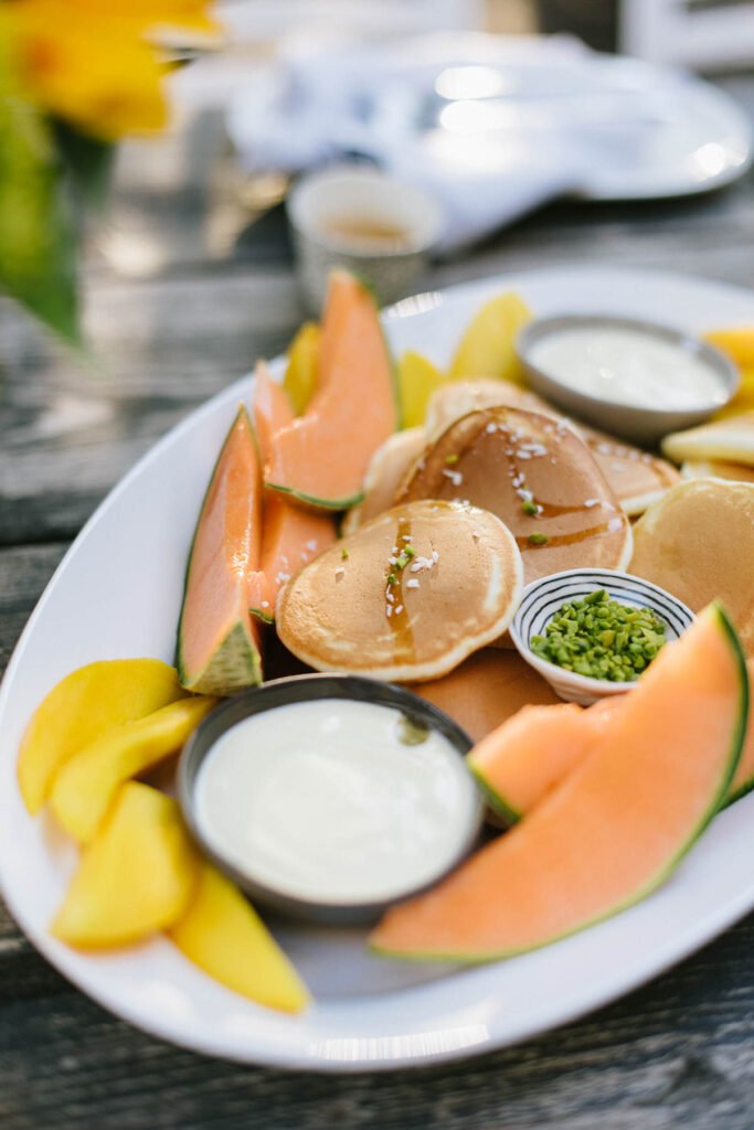Wir nutzen dafür diese Tefal Pfanne (Affiliate Link). Dank ihrer Beschichtung verzichten wir auf Fett und Öl. - Richtet die warmen Pancakes mit dem frischen Obst auf einer Platte an.