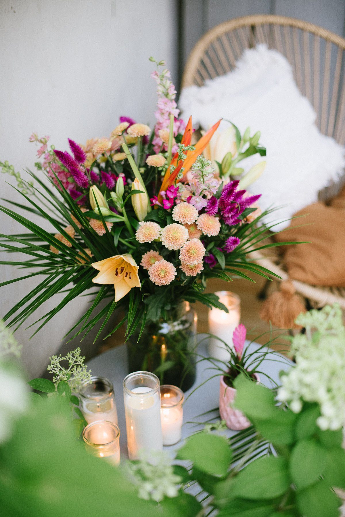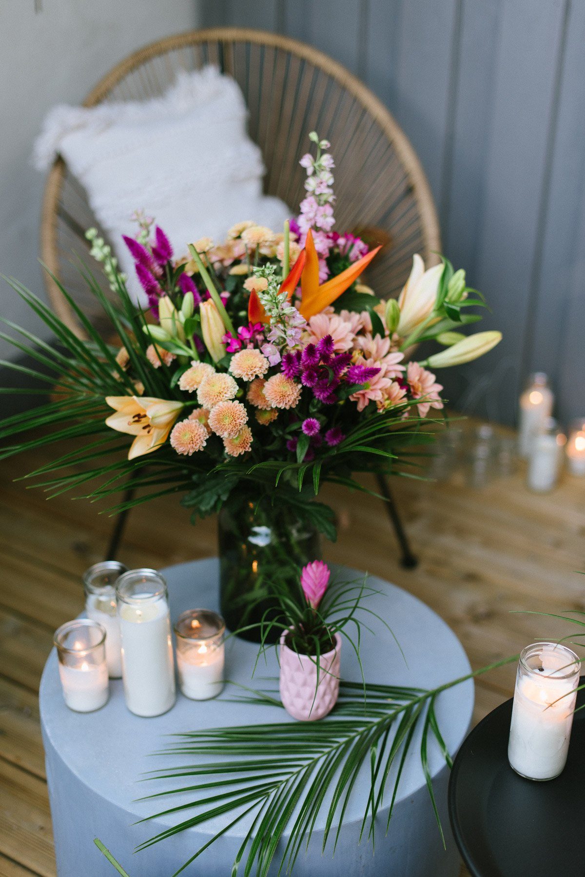 Ist dieser Strauß nicht eine wahre Pracht? Die Fülle an Farben, die üppigen Blumen und die exotischen Besonderheiten machen ihn so außergewöhnlich.