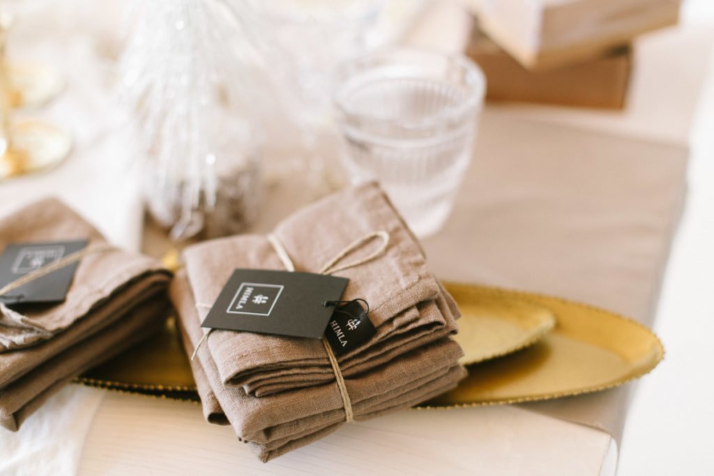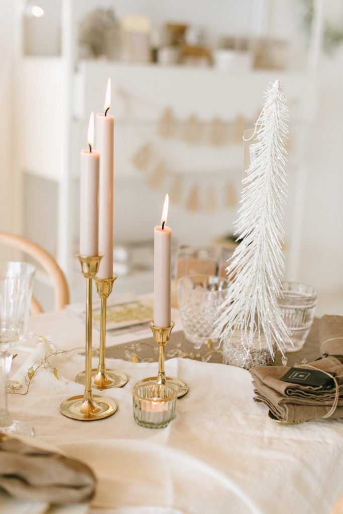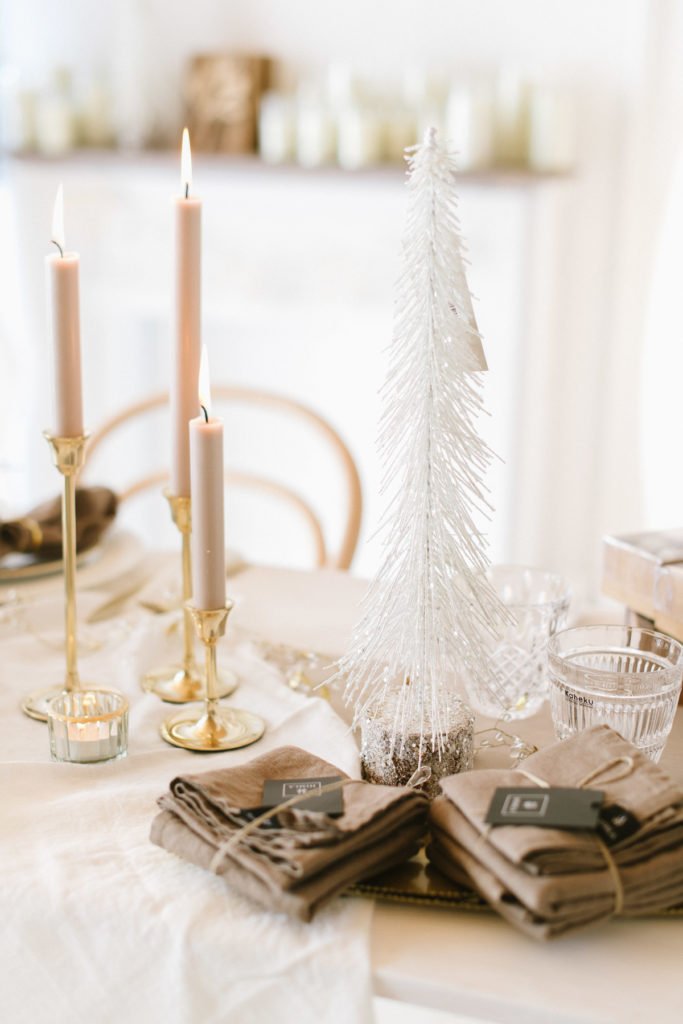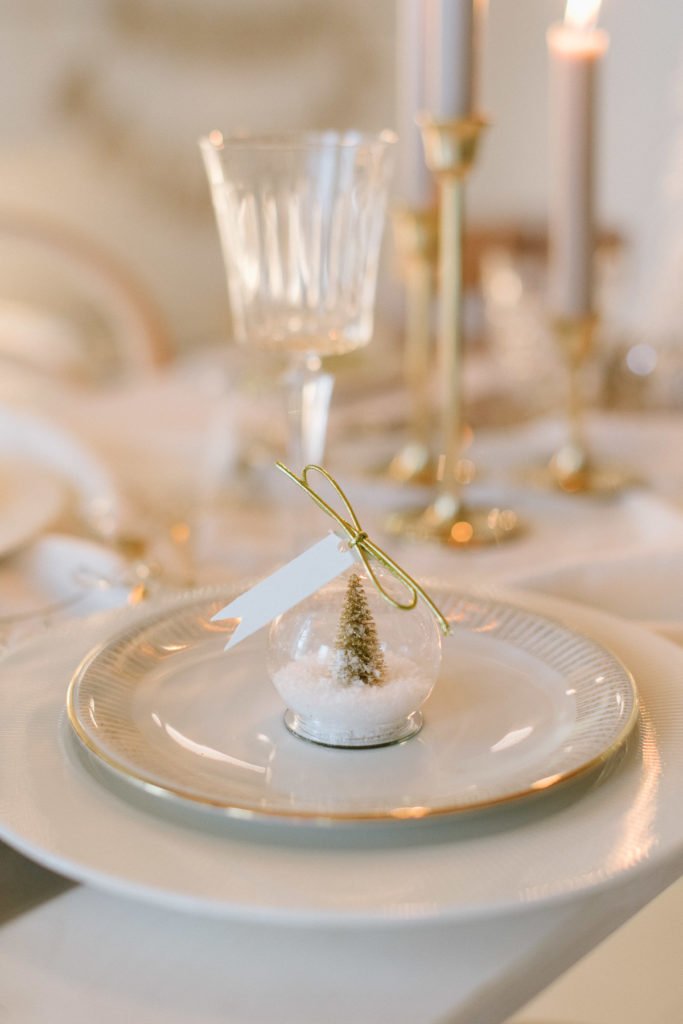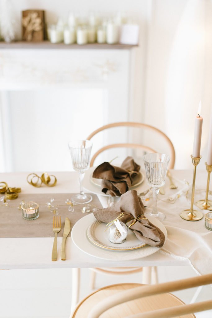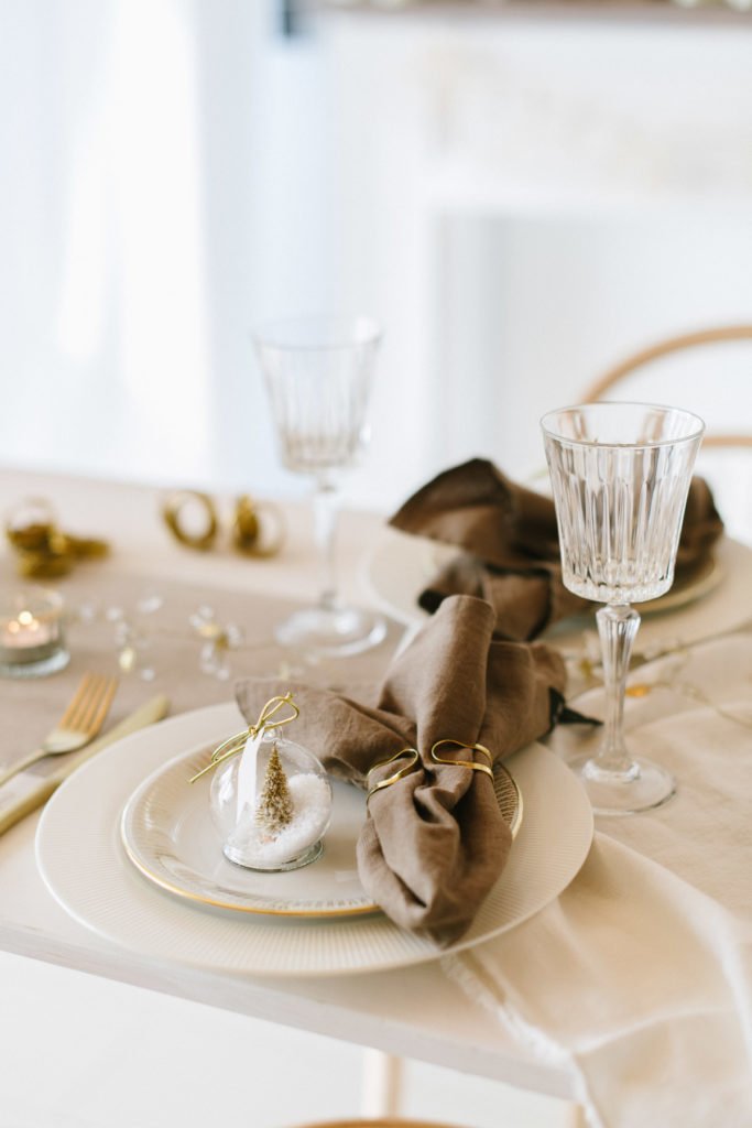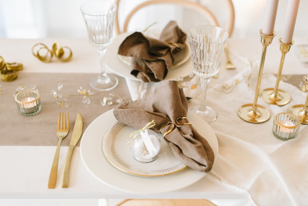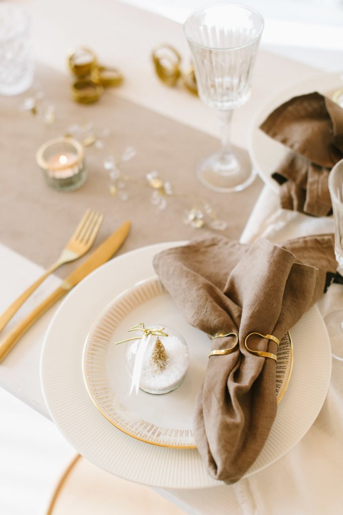 Hingucker auf der liebevoll eingedeckten Tafel sind die schlichten goldenen Serviettenringen, die die Leinenservietten locker in Form halten. Als Gastgeschenk haben wir die goldenen Schneekugeln auf jeden Platz gelegt und schreiben die Namen der Gäste auf die kleinen Schildchen. Darüber werden sich alle sehr freuen.