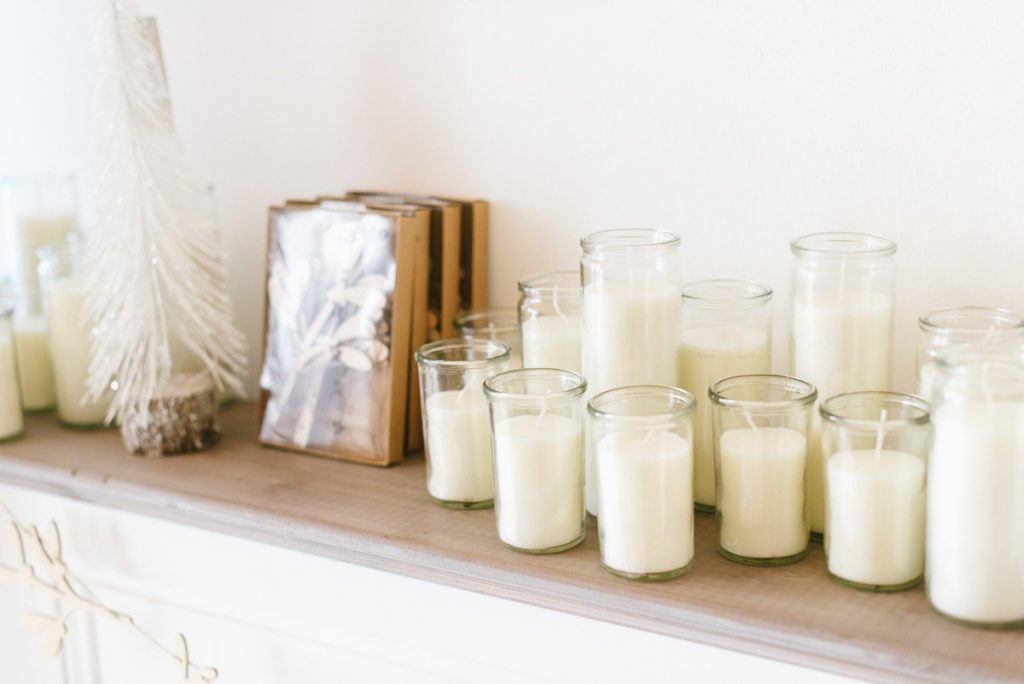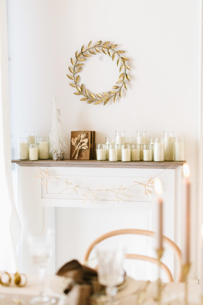 Die kahle Wand über dem gemütlichen Kamin schmücken wir mit unserem Dekokranz aus goldenen Metallblättern. Auf dem Kaminsims tummeln sich Kerzen im Glas verschiedener Größen.