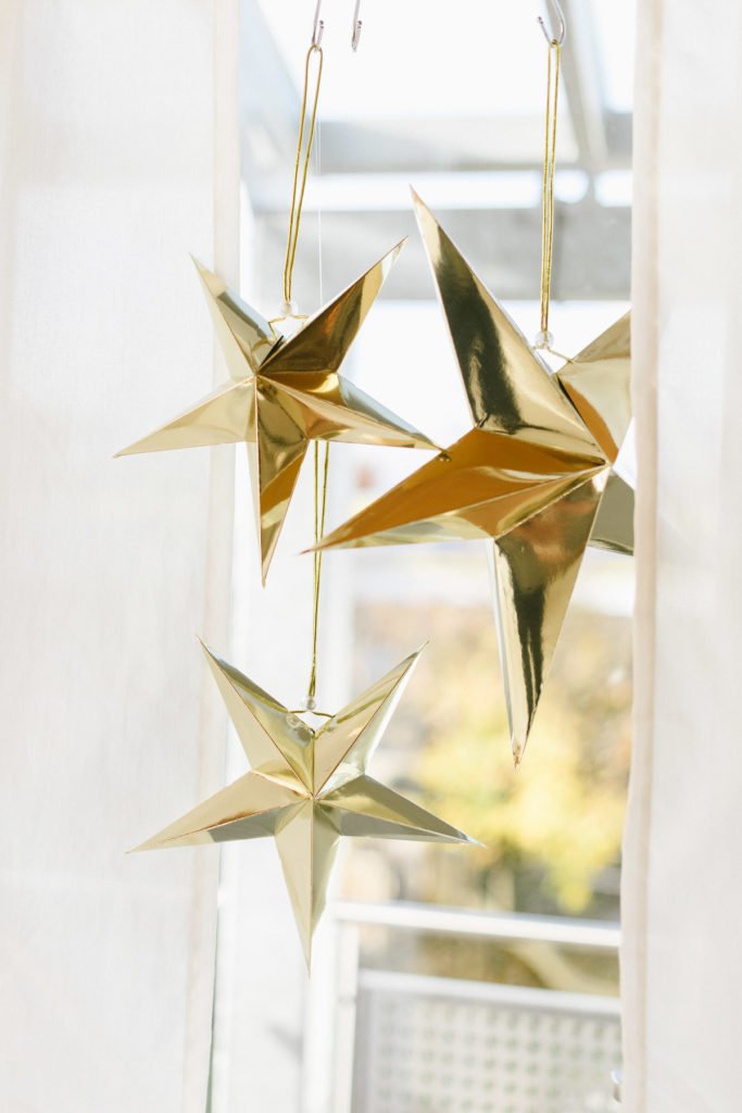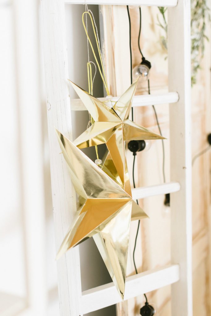 Verschieden große glänzende Papiersterne haben wir im Raum verteilt. Ein paar der goldfolierten Sterne hängen im Fenster, andere an einer Leiter.