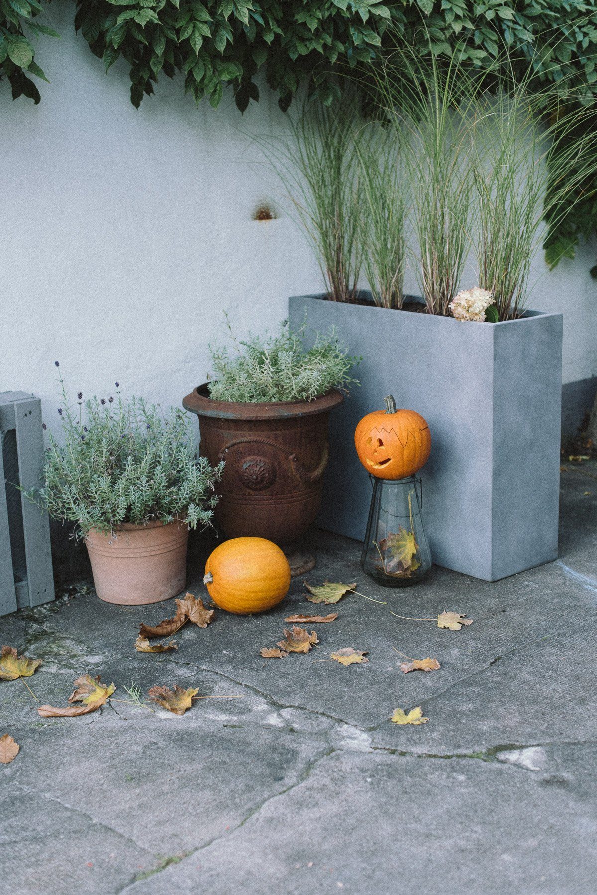 Immer wieder nehme ich mir vor auch einen mit einem schönen Lochmuster zu gestalten, doch nach zwei großen Kürbissen, die für die Kids vorbereitet werden, ist die Energie dahin. Deshalb sitzen auch in diesem Jahr nur wieder zwei liebe Gesellen im Hof und erfreuen Passanten beim Vorbeigehen.
