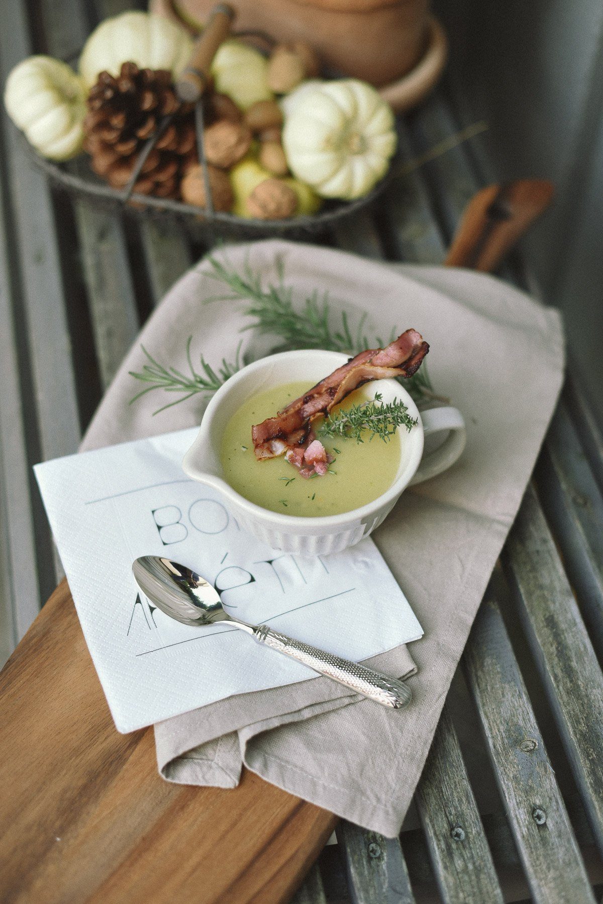 Nach der Anreise zählt nur eins: die Beine vertreten und einen Happen essen. Zur Begrüßung gibt’s deshalb erst mal eine kräftige Kartoffelsuppe zur Stärkung. Wer mag, streut noch knusprige Speckwürfel hinein, oder dippt einen Streifen kross gebratenen Schinken.