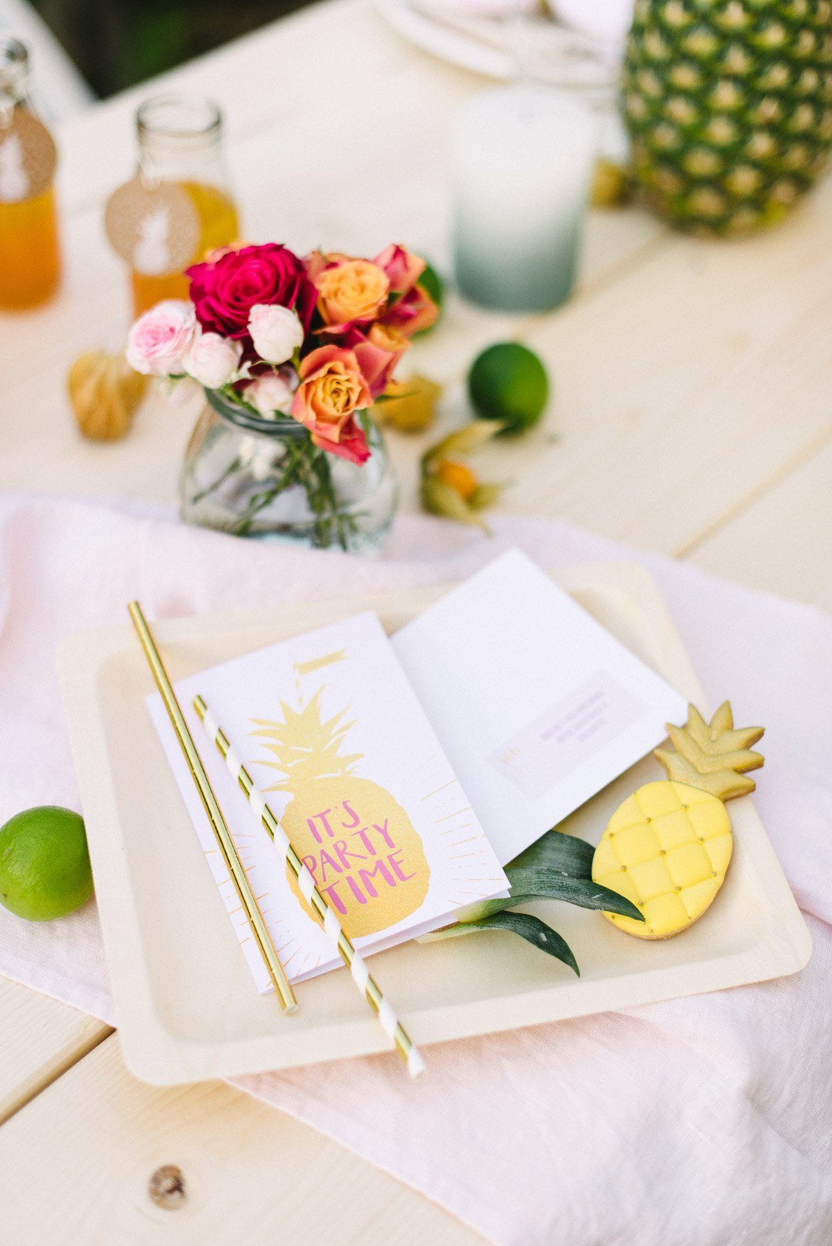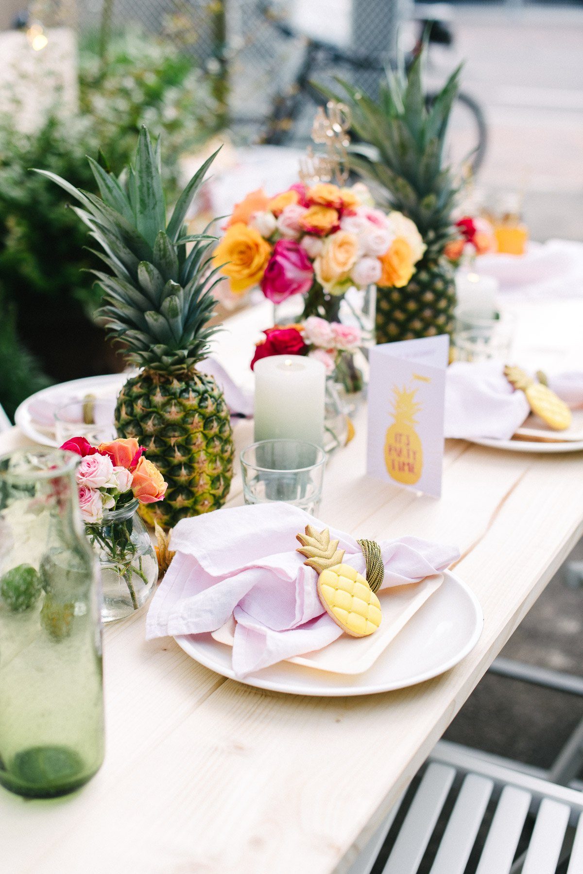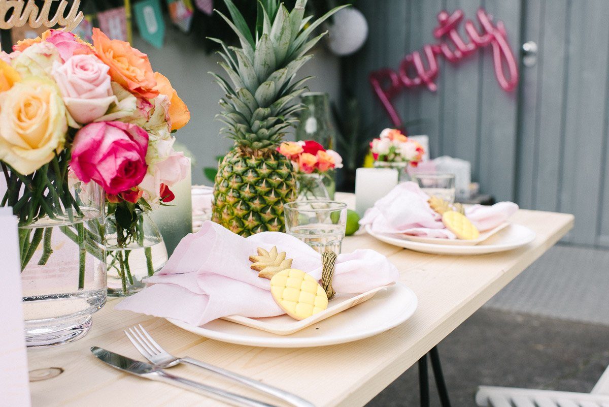 Ansonsten ist der Tisch mit schlichten, weiße Tellern und den großartigen, rosa Leinenservietten eingedeckt. Goldenen Serviettenringe fassen sie locker zusammen. Hingucker ist das Gastgeschenk: die tollen Ananaskekse haben wir bei Zuckermariechen bestellt. Dort gibt es viele weitere Keksmotive, die auch gerne nach Euren Wünschen gebacken werden.