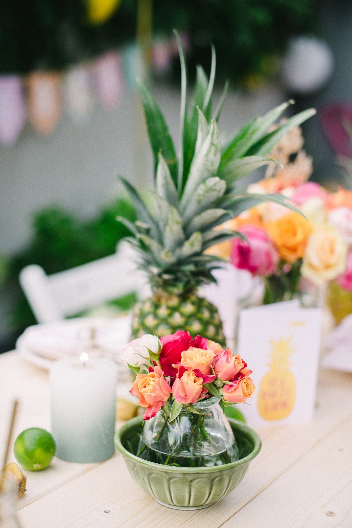 Zwei echte Ananas, mehrere Limetten und einige Physalis bringen tropische Hingucker auf die Tafel. Besonders praktisch: nach der Party kann die Dekoration einfach aufgegessen werden!