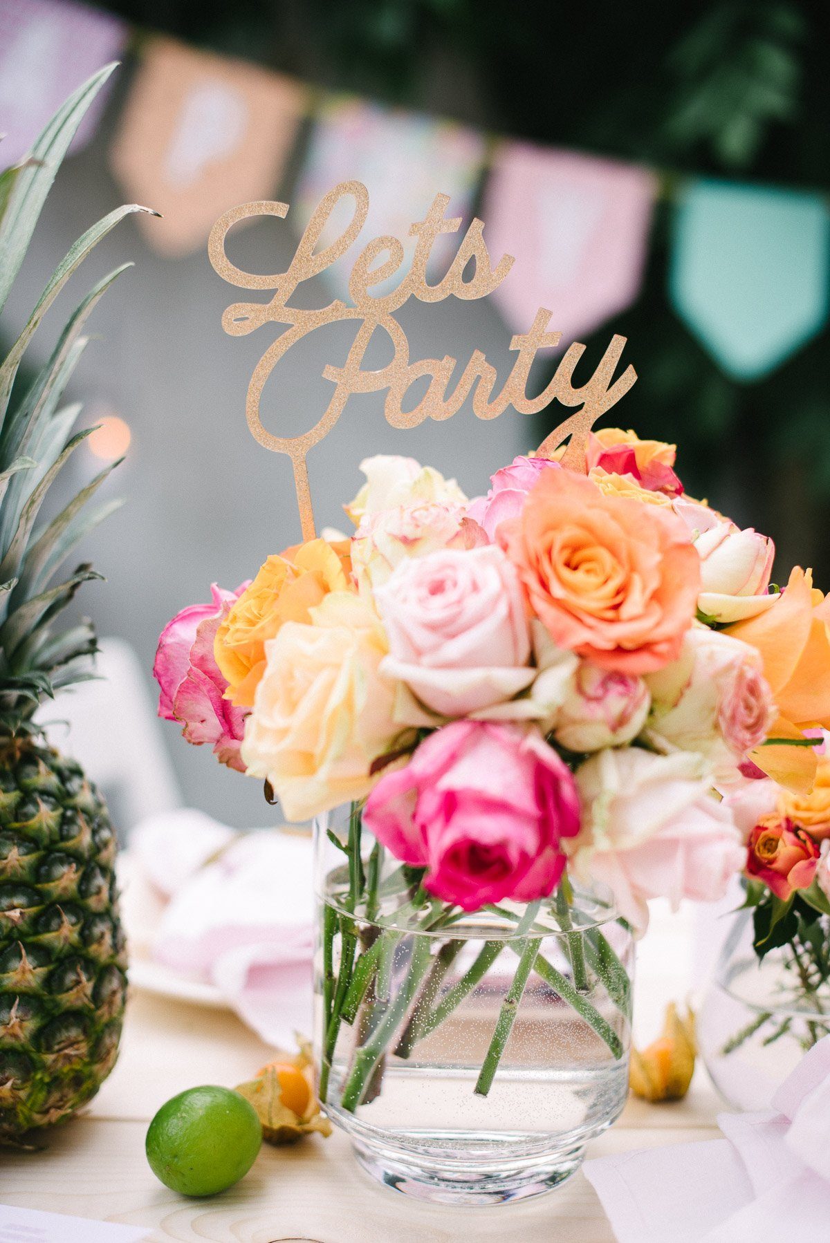Die Rosen haben wir in mehreren kleinen, bauchigen Gläsern verteilt. Egal ob Rosa, Gelb oder Rot – mischt man die unterschiedlichen Rosen, ergibt sich ein farbenfrohes Ensemble auf dem Tisch. Ein großes Bouquet bildet den Mittelpunkt der Dekoration. So herrlich üppig und prächtig schauen sie aus! Wir haben einen Cake Popper zweckentfremdet. Ein golden glitzerndes ‘Let’s Party’ krönt nun den großen Rosenstrauss.