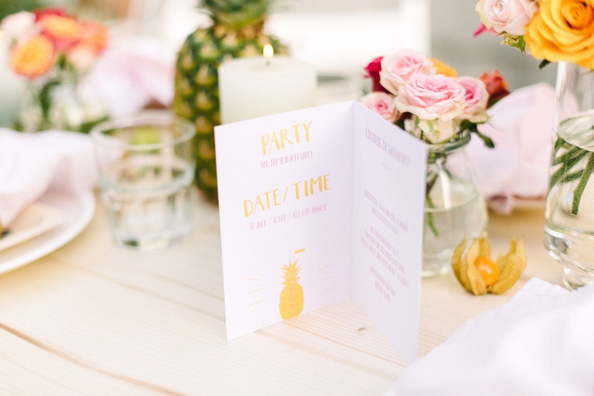 Solch ein Fest verdient natürlich auch eine richtige Einladung! Die Tropical Fruit Einladung der Kartenmacherei ist wie geschaffen für unser Fest. Eine stylische Ananas ziert die Vorderseite, im Innenteil finden alle Infos zur Party Platz. Lasst Euch am besten gleich die passenden Briefumschläge mitliefern. Auch sehr praktisch und schön: passende Adressetiketten. Einfach aufkleben und schon wissen alle Empfänger, wer ihnen schreibt.