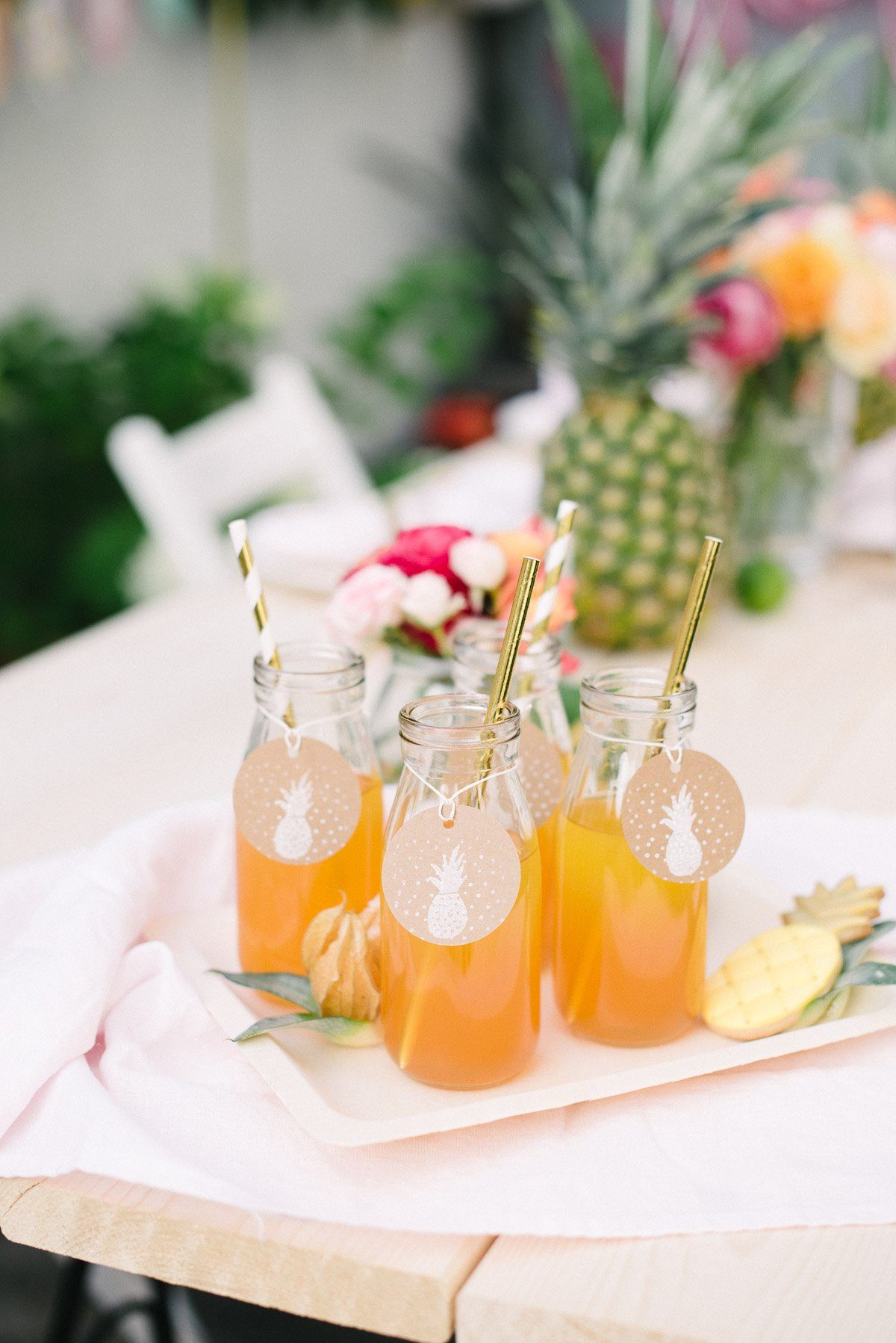 Mit goldenen Papierstrohhalmen und einen süßen Anhänger mit Ananasstempel wird daraus ein passender Signatur Drink.