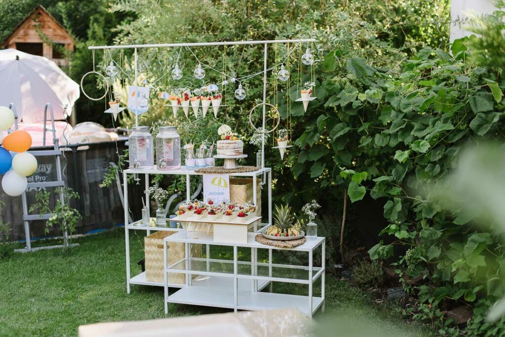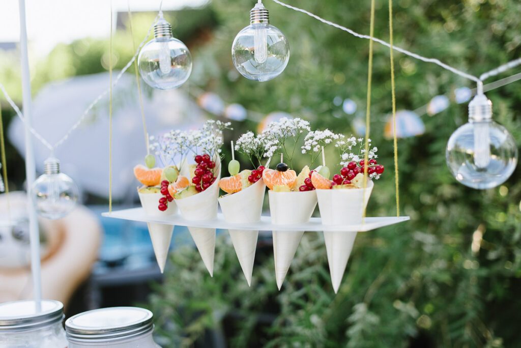 Auf einem kleinen Buffet wird alles arrangiert. Wir haben uns etwas besonderes überlegt: Snackhörnchen mit Waffelstückchen und Obst. Einige stehen in einem Board, andere hängen als Flying Dessert über dem Buffet und sehen auch noch sehr dekorativ aus.