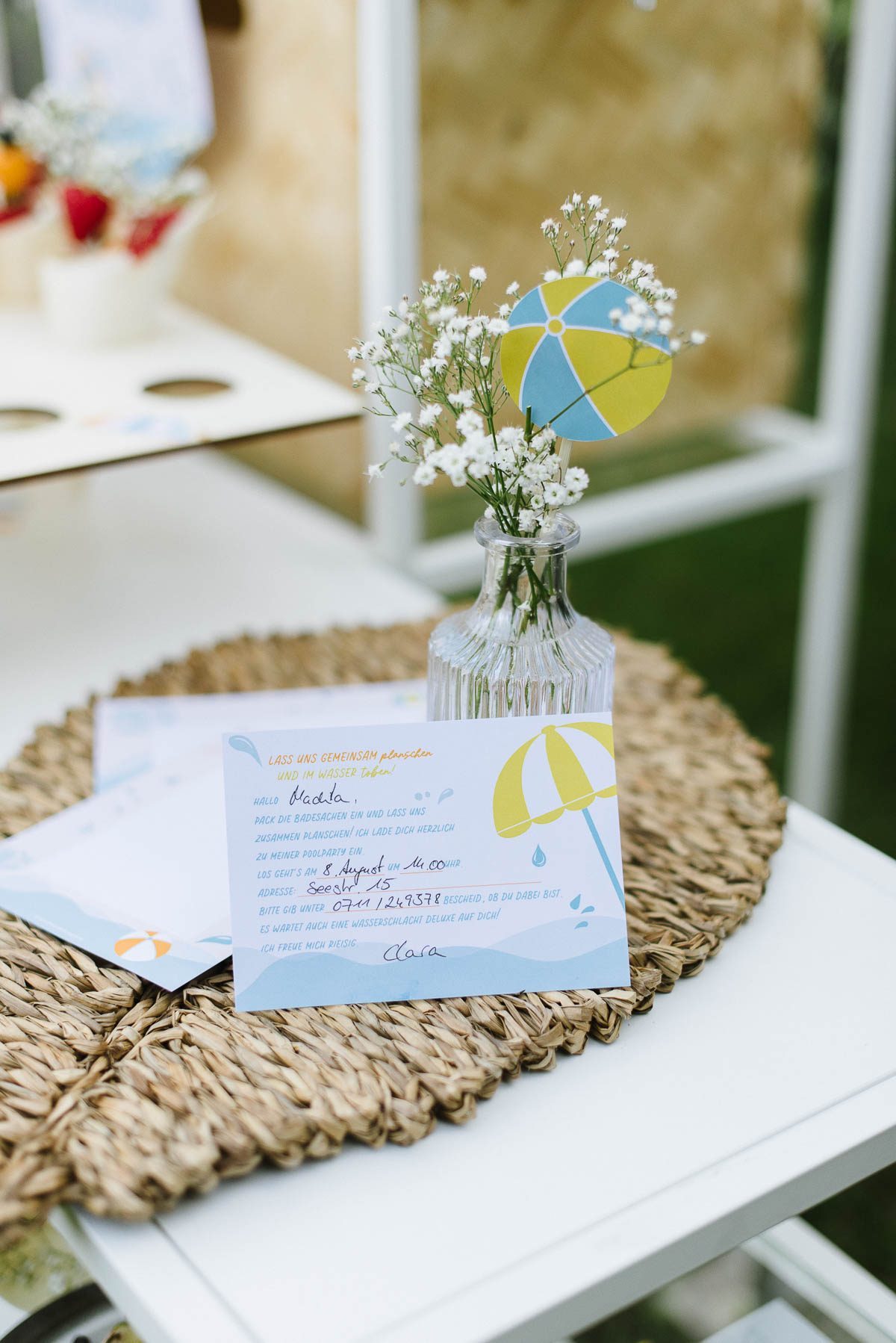 Der Kreativität sind keine Grenzen gesetzt: Vom beschrifteten Schwimmring bis hin zur einfachen Karte ist alles möglich. Zugaben wie Wasserbomben oder kleine Spritzpistolen steigern sicher die Vorfreude.