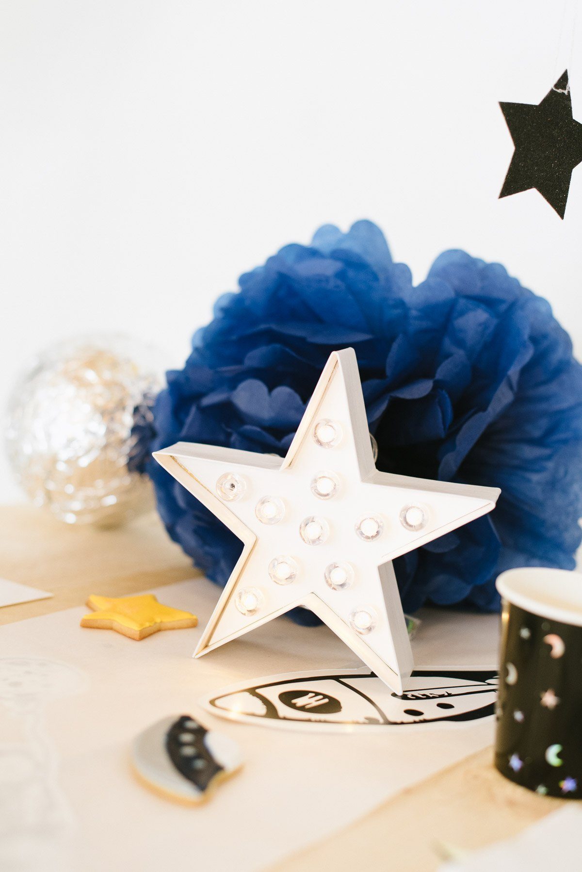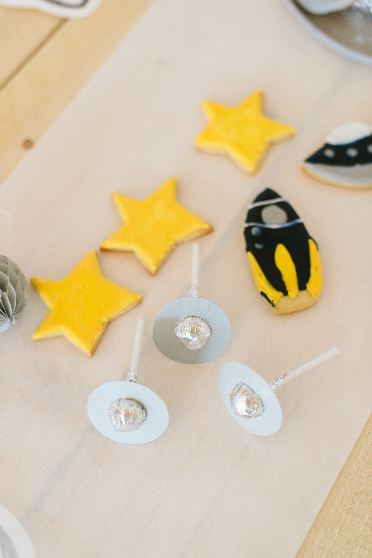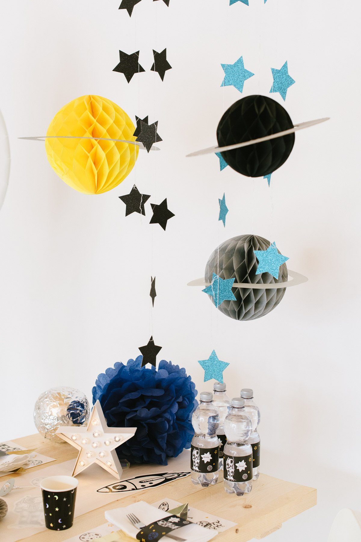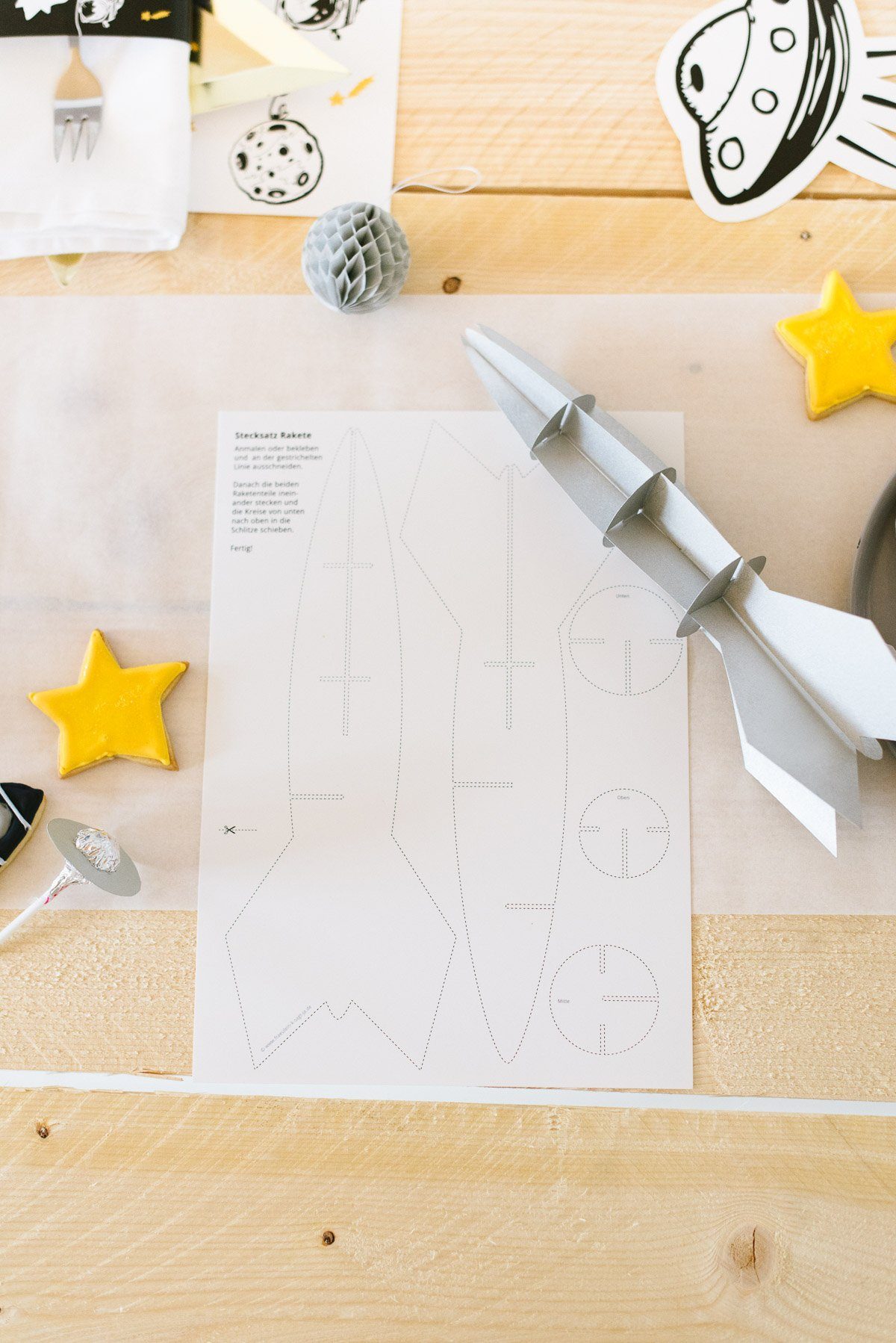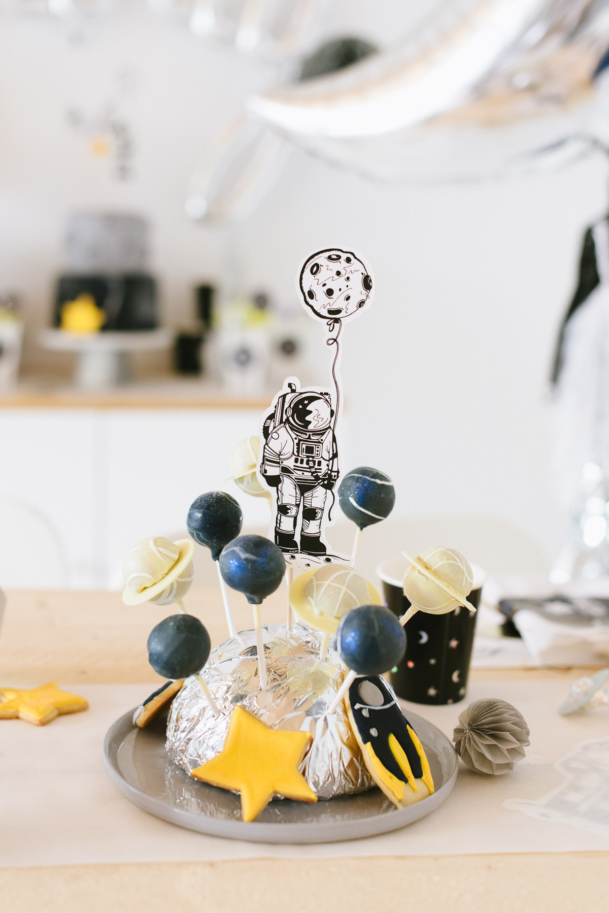 Planeten kreisen über dem Geburtstagstisch, ein großer Mond funkelt, auf der Weltraumtorte spaziert ein Astronaut und die Planeten Cakepops stehen zum Naschen bereit. Die Astronauten dürfen sich niederlassen und genießen nachdem sie ihre Raketen fertig gebaut und beim Wurfspiel Angriffe abgewehrt haben.