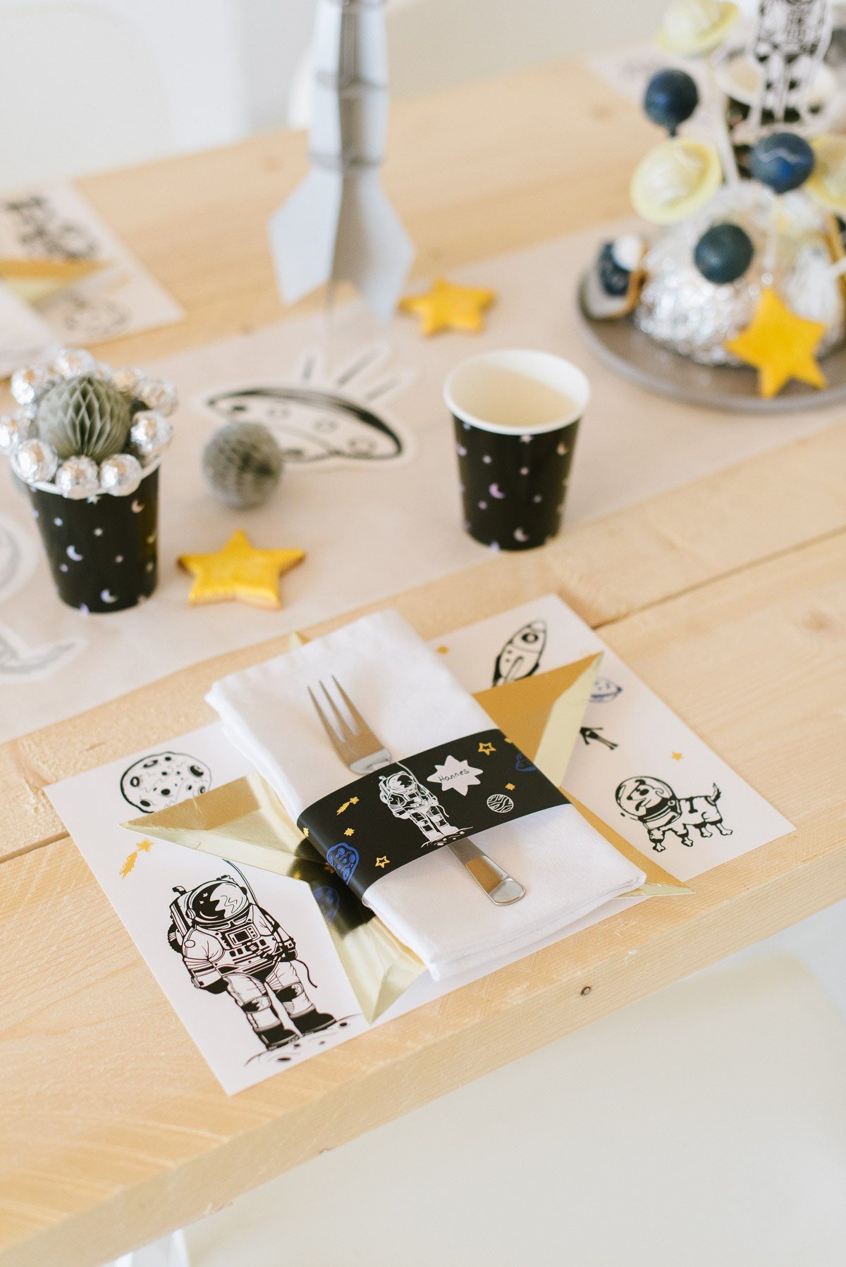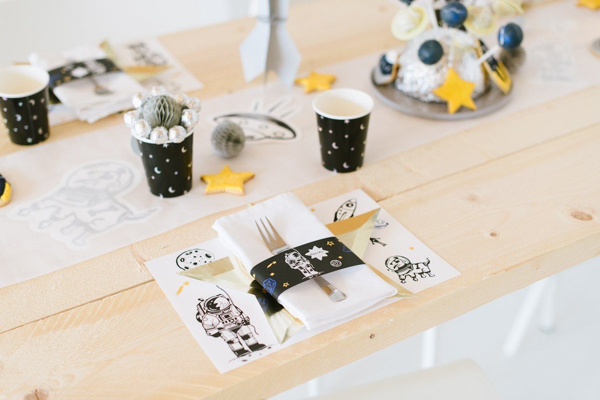 Ferne Welten erobern die Astronauten bei diesem Kindergeburtstag. Die Dekoration des Tisches greift dieses Thema auf. Ein stylischer und liebevoll gedeckter Tisch steht für die Kids bereit. Das Platzset mit Weltraummotiven bildet die Basis. Coole goldene Pappteller in Sternform sind sicher ein Hingucker.