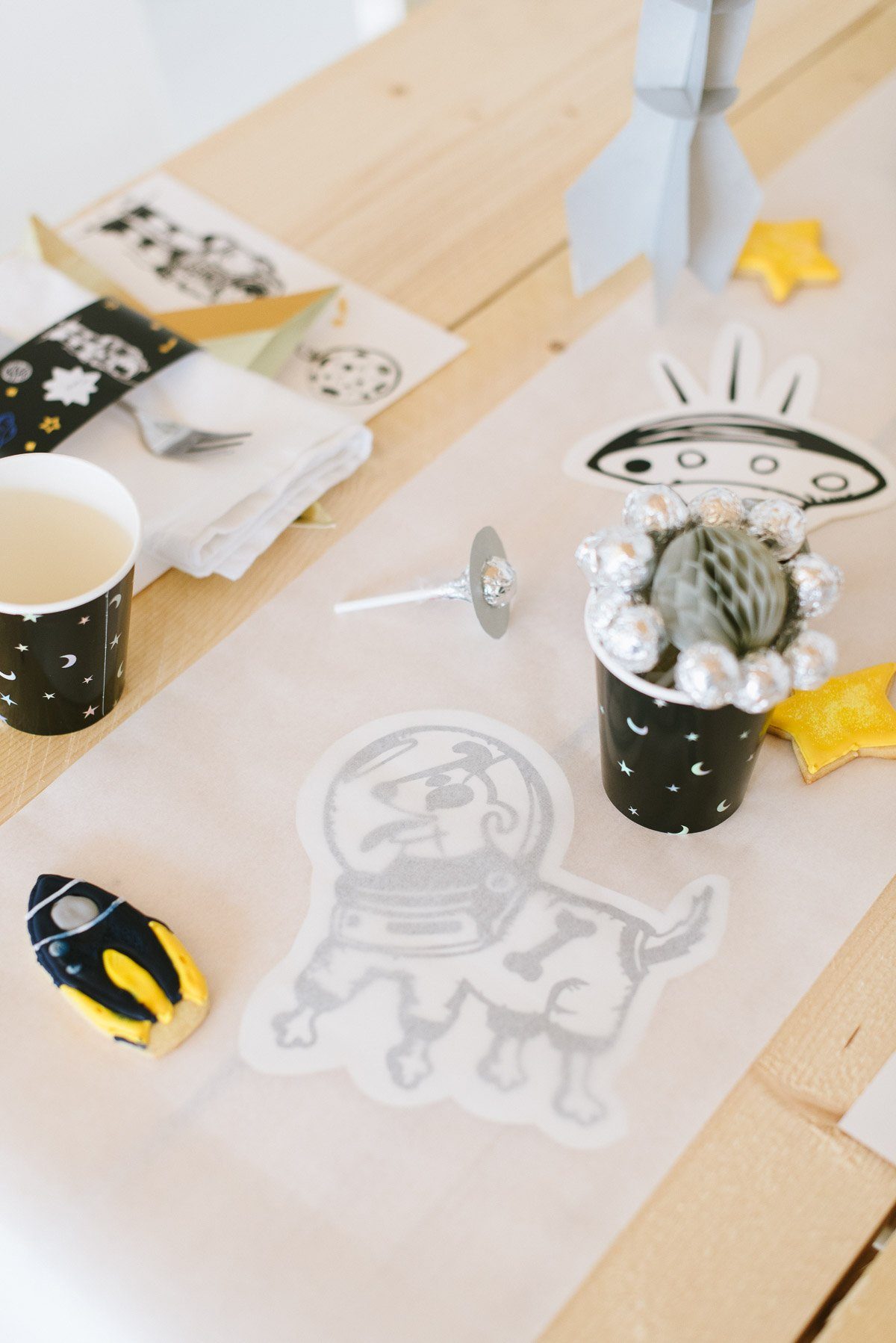Die Dekoration setzt sich auf dem Tisch fort. Ein langer Streifen Butterbrotpapier dient als Tischläufer. Auf und unter ihm tummeln sich ausgeschnittene Weltraummotive, die sich ebenfalls in der Geburtstagsbox befinden.