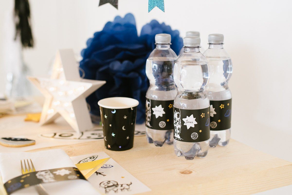 Die Banderole, auf der auch der Name des Gasts vermerkt ist, umschlingt die Serviette. Alternative könnt ihr sie auch zum Markieren der Getränkeflaschen nutzen. Außerdem stehen Pappbecher mit galaktischem Mustern bereit.