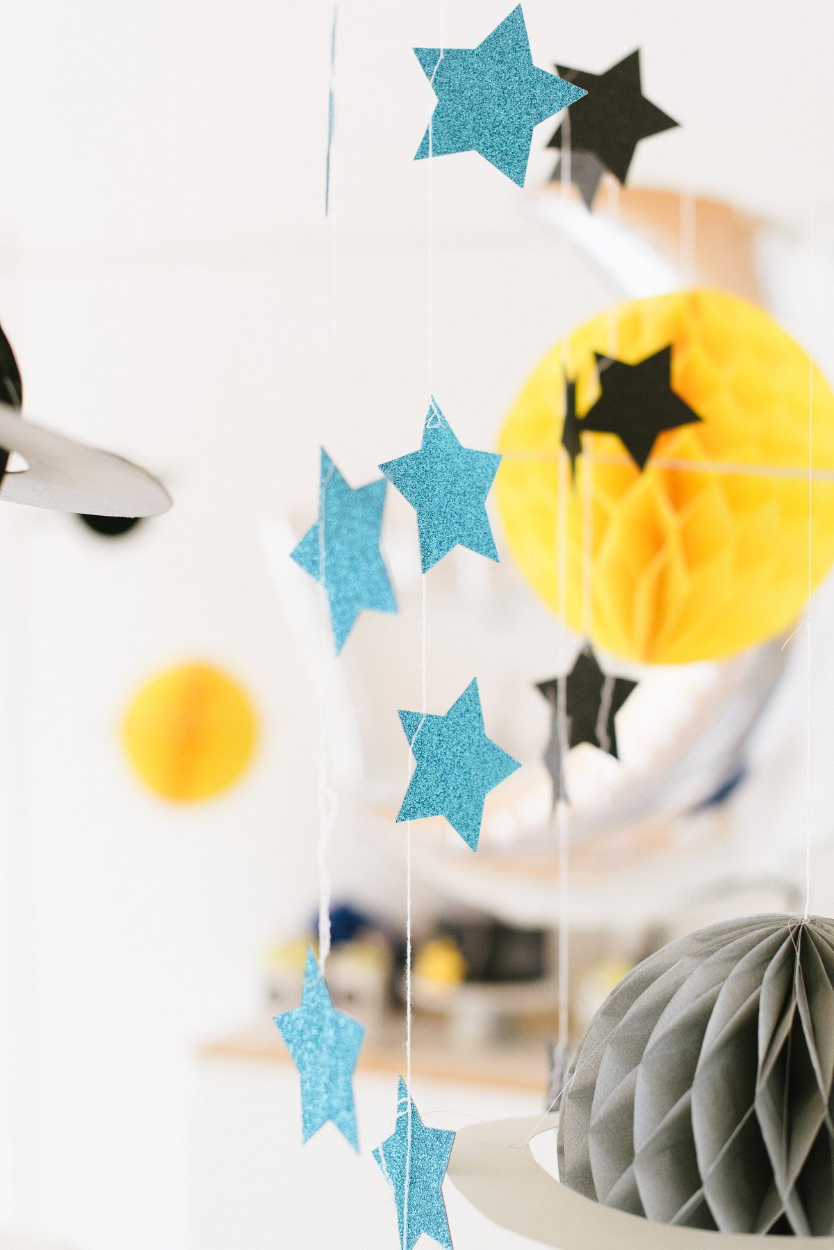 Der Raum verstreut ebenfalls Weltraumatmosphäre. Wabenbälle werden durch Umlaufbahnen aus Karton zu Planeten. Dazwischen funkeln die Sterne einer glitzernden Girlande. Zwei große Sternluftballone sorgen endgültig für ein galaktisches Gefühl.