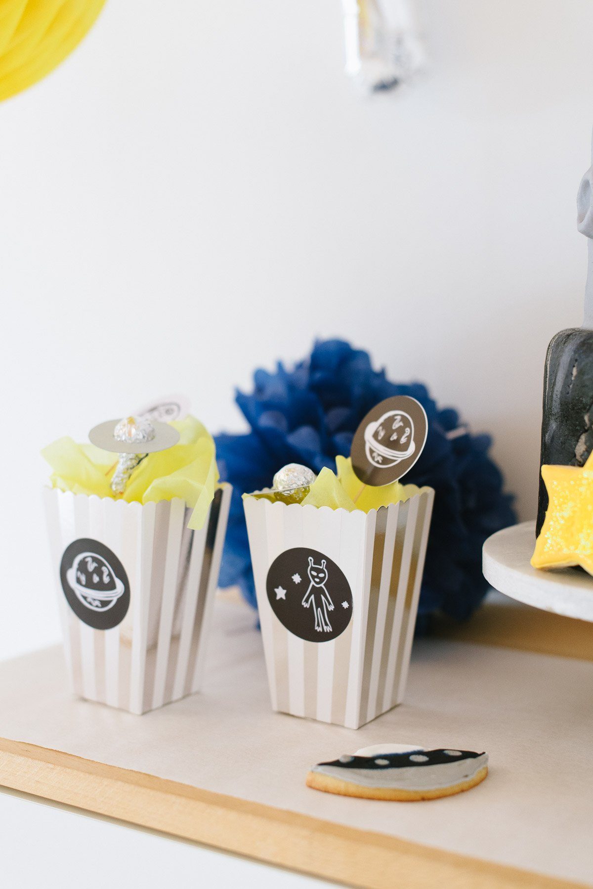 Die Mitgebsel verstecken sich bei diesem Geburtstag hübschen Pappbechern, die einen Sticker und etwas Seidenpapier verziert werden. Darin ist reichlich Platz für ein kleines Geschenk und ein paar Süßigkeiten. Die Planetenlollies dürfen natürlich auch nicht fehlen!