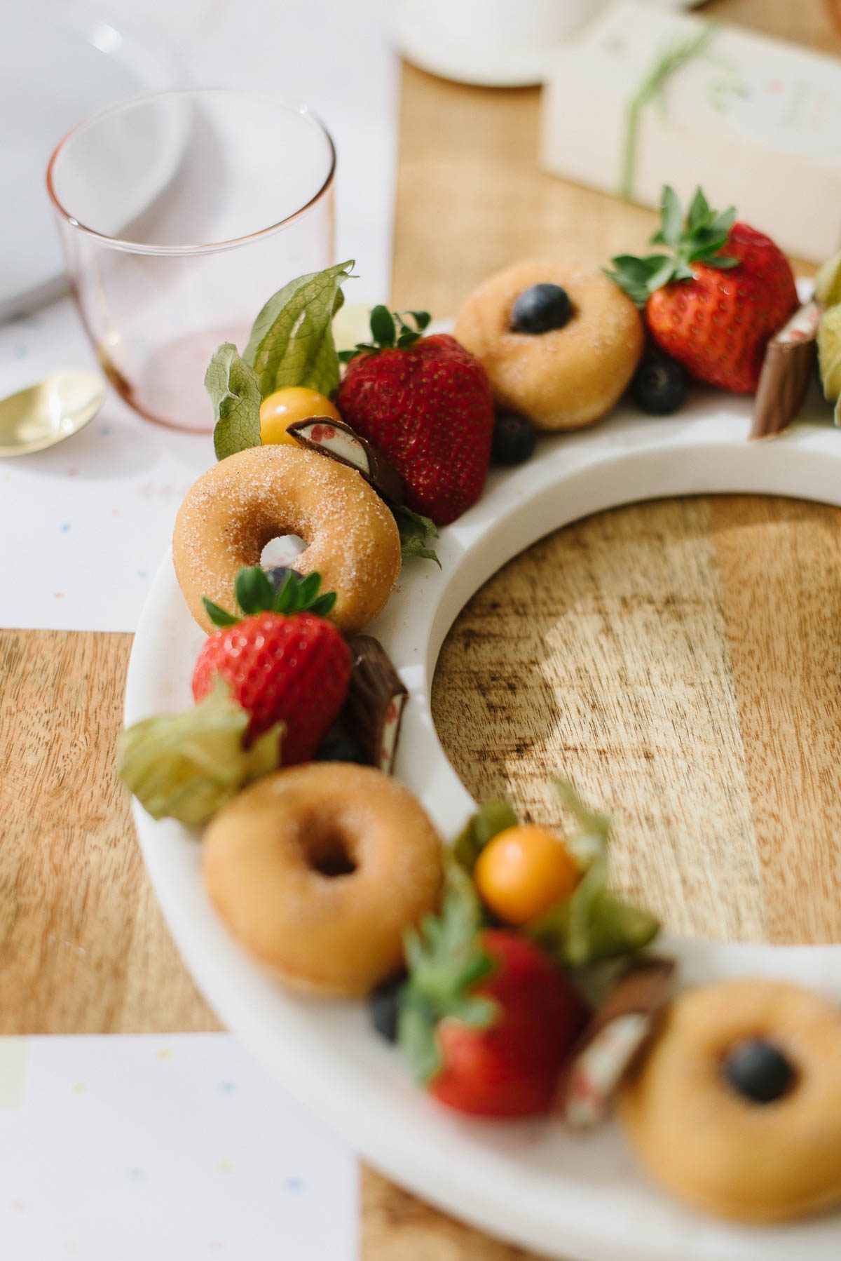 Für die Einschulung haben wir Erdbeeren, Physalis, Blaubeeren, Minidonuts und aufgeschnittene Schokolriegel kombiniert. Einfach auf einer schönen Platte anrichten und danach genießen.