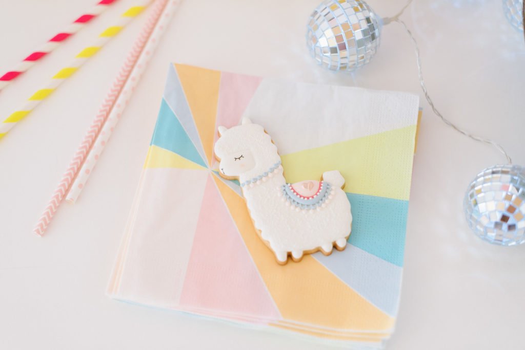 Das Partygeschirr mit geometrischem Pastellmuster passt hervorragend dazu. Teller und Servietten in schönen Pastellfarben findet Ihr in unserem Shop! Auch Leinenservietten in Mint oder Rosé sind denkbar. Locker zusammen gerollt werden sie von einem Garn gehalten. Ein Lama Anhänger aus Papier krönt das Ensemble.
