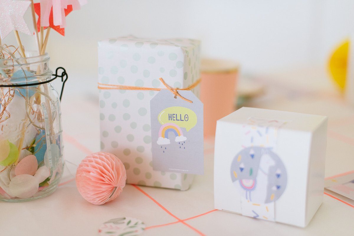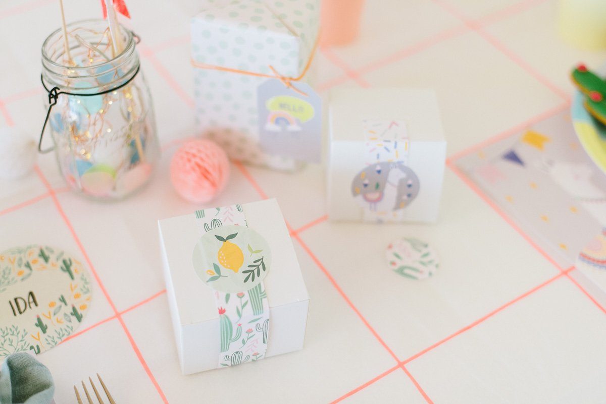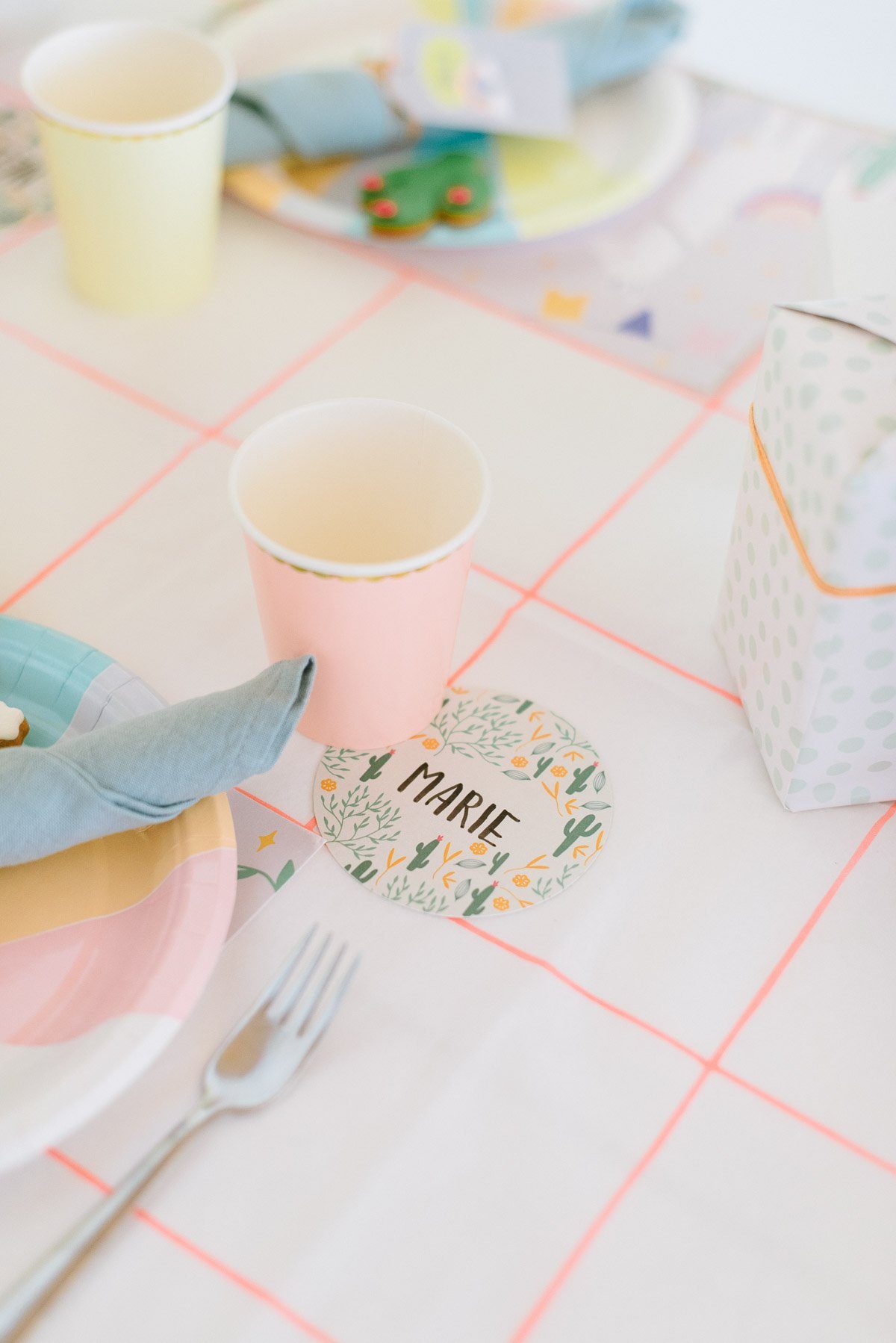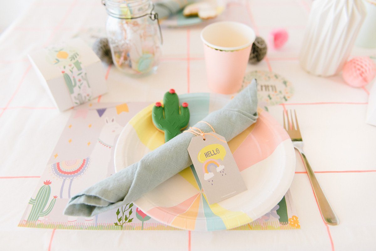 Das Partygeschirr mit geometrischem Pastellmuster passt hervorragend dazu. Teller und Servietten in schönen Pastellfarben findet Ihr in unserem Shop! Auch Leinenservietten in Mint oder Rosé sind denkbar. Locker zusammen gerollt werden sie von einem Garn gehalten. Ein Lama Anhänger aus Papier krönt das Ensemble.