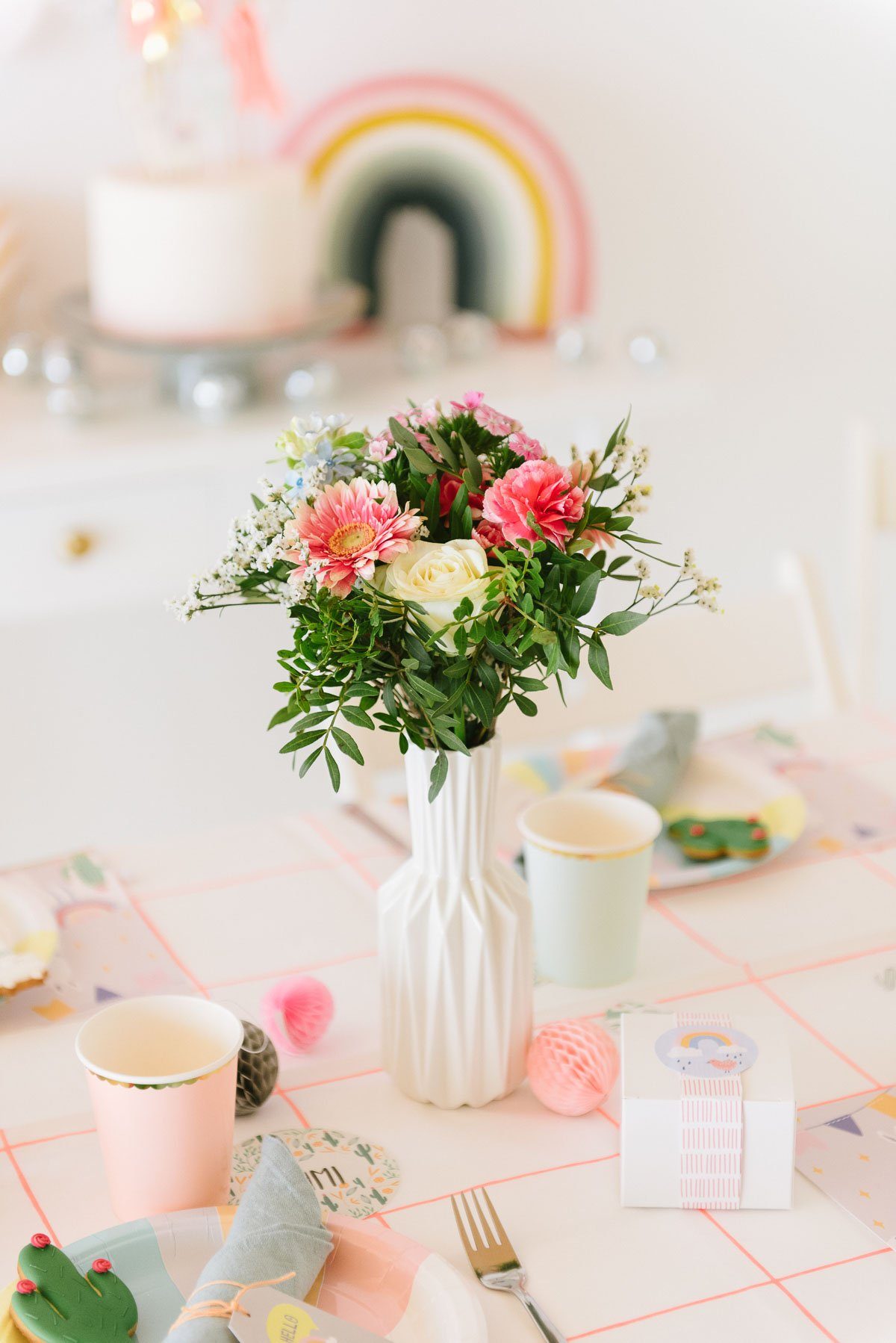 Zugegeben, es ist ein sehr femininer Look. Aber dennoch so schön! Die zarten Pastellfarben passen einfach perfekt zum Lama Motto. Auf dem Tisch fällt jedoch zuerst die Tischdecke mit kräftigem Karomuster auf. Sie setzt den saften Farben einen kräftigen Kontrast.