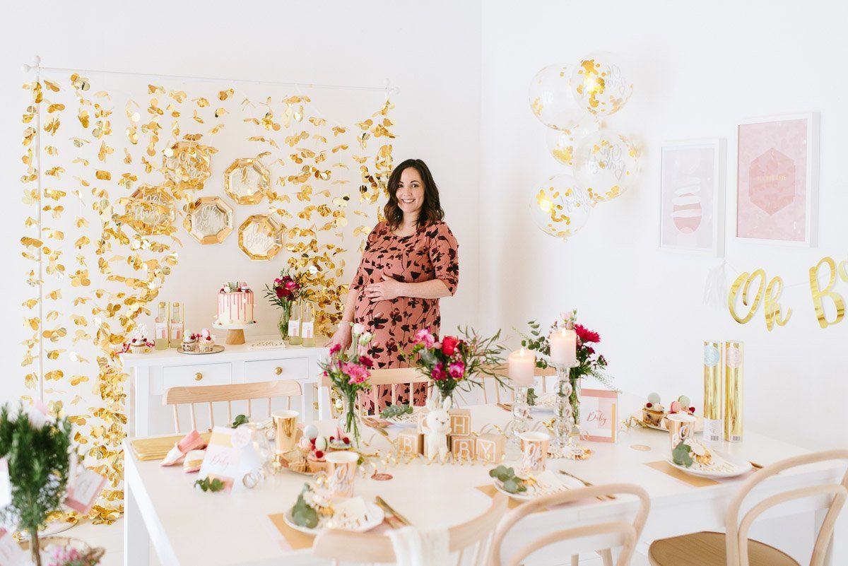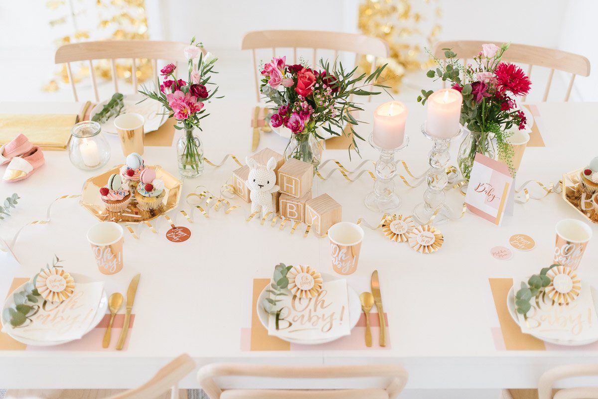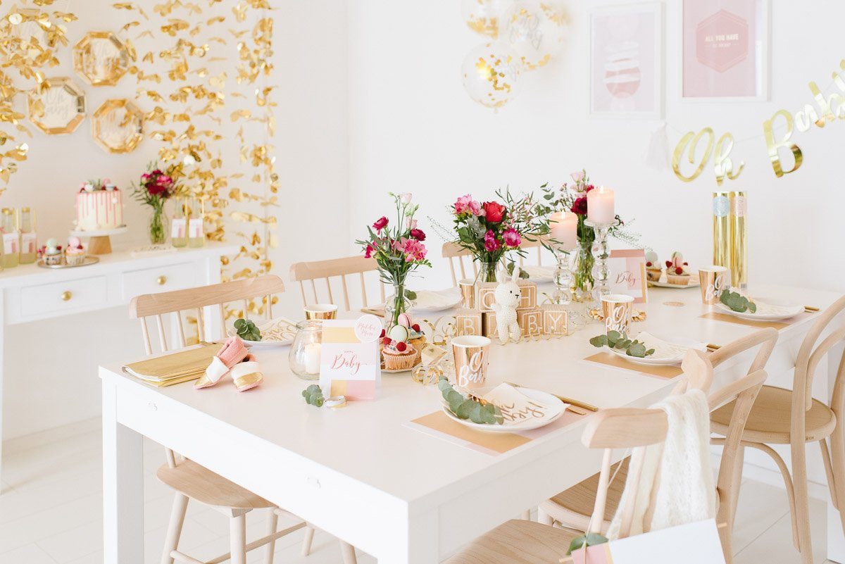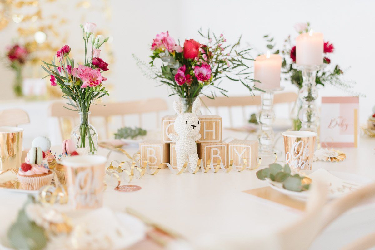 Ein schönes Ambiente mit liebevoller und dennoch moderner Dekoration schafft die perfekte Atmosphäre. Im Frl. K Shop findet Ihr viele coole Dekorationselemente für eine Babyparty. Gold spielt auch hier als Trendfarbe eine große Rolle! Die süßen Holzwürfel sind nicht nur Dekoration. Sie können auch als Gästebuch genutzt werden, in dem sich alle mit einem Gruß darauf verewigen.