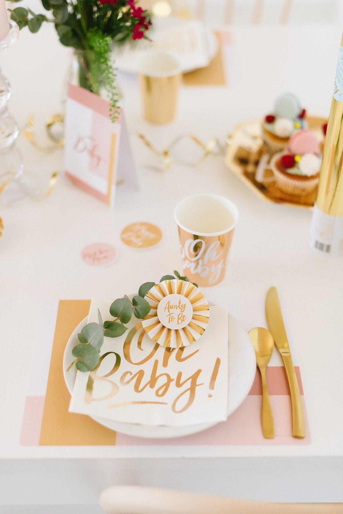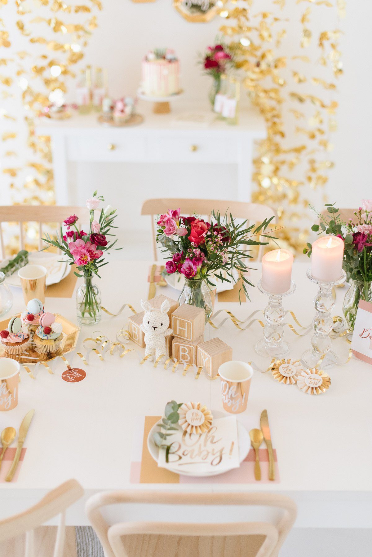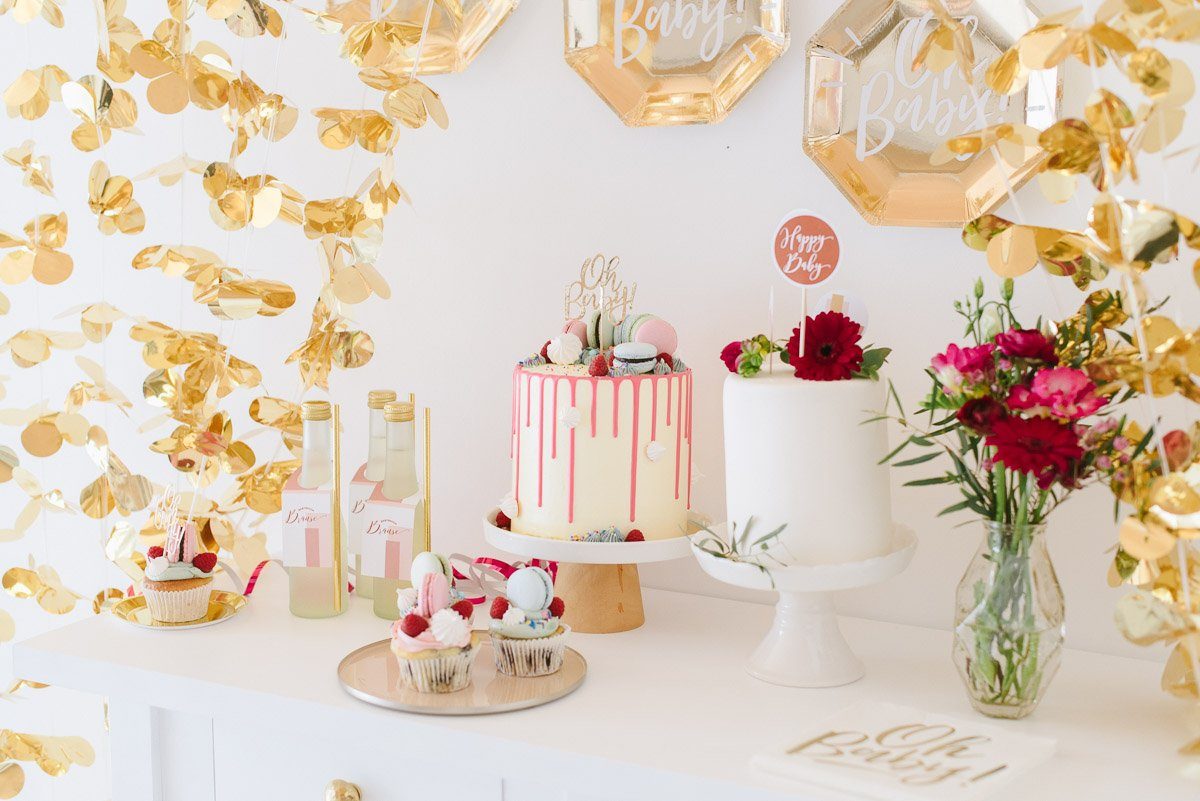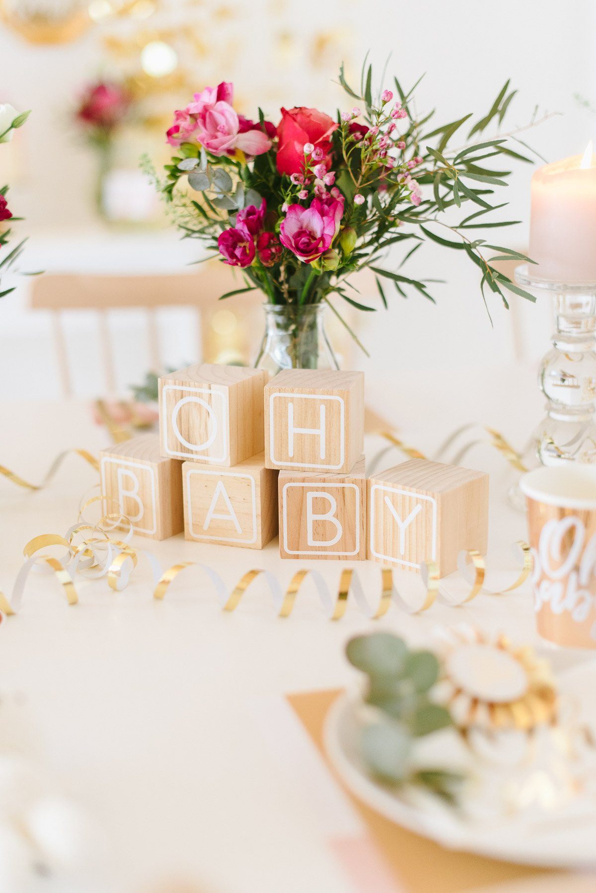Ein schönes Ambiente mit liebevoller und dennoch moderner Dekoration schafft die perfekte Atmosphäre. Im Frl. K Shop findet Ihr viele coole Dekorationselemente für eine Babyparty. Gold spielt auch hier als Trendfarbe eine große Rolle! Die süßen Holzwürfel sind nicht nur Dekoration. Sie können auch als Gästebuch genutzt werden, in dem sich alle mit einem Gruß darauf verewigen.