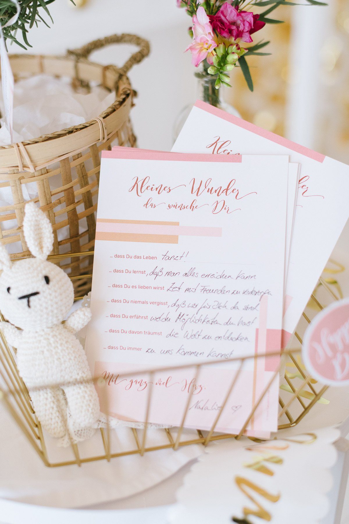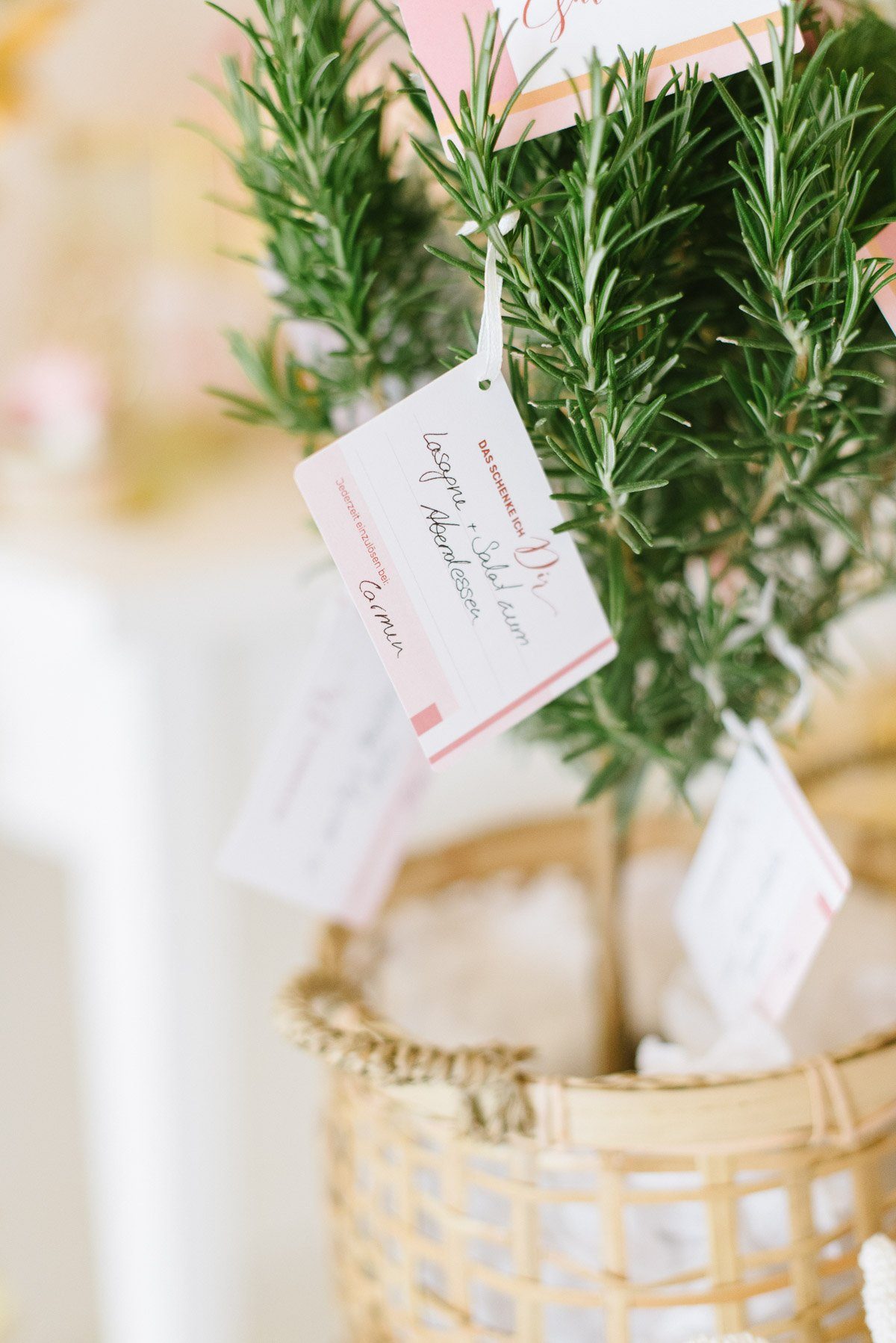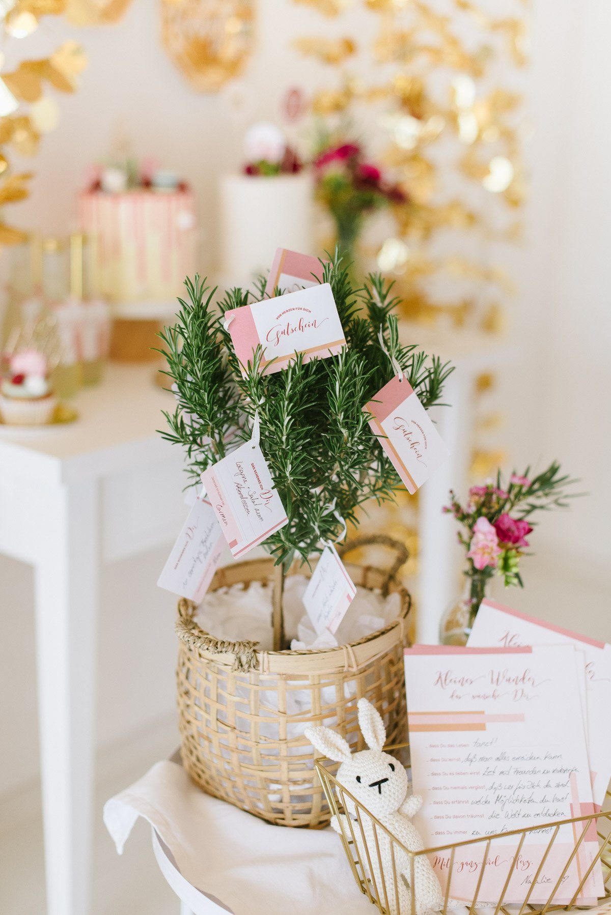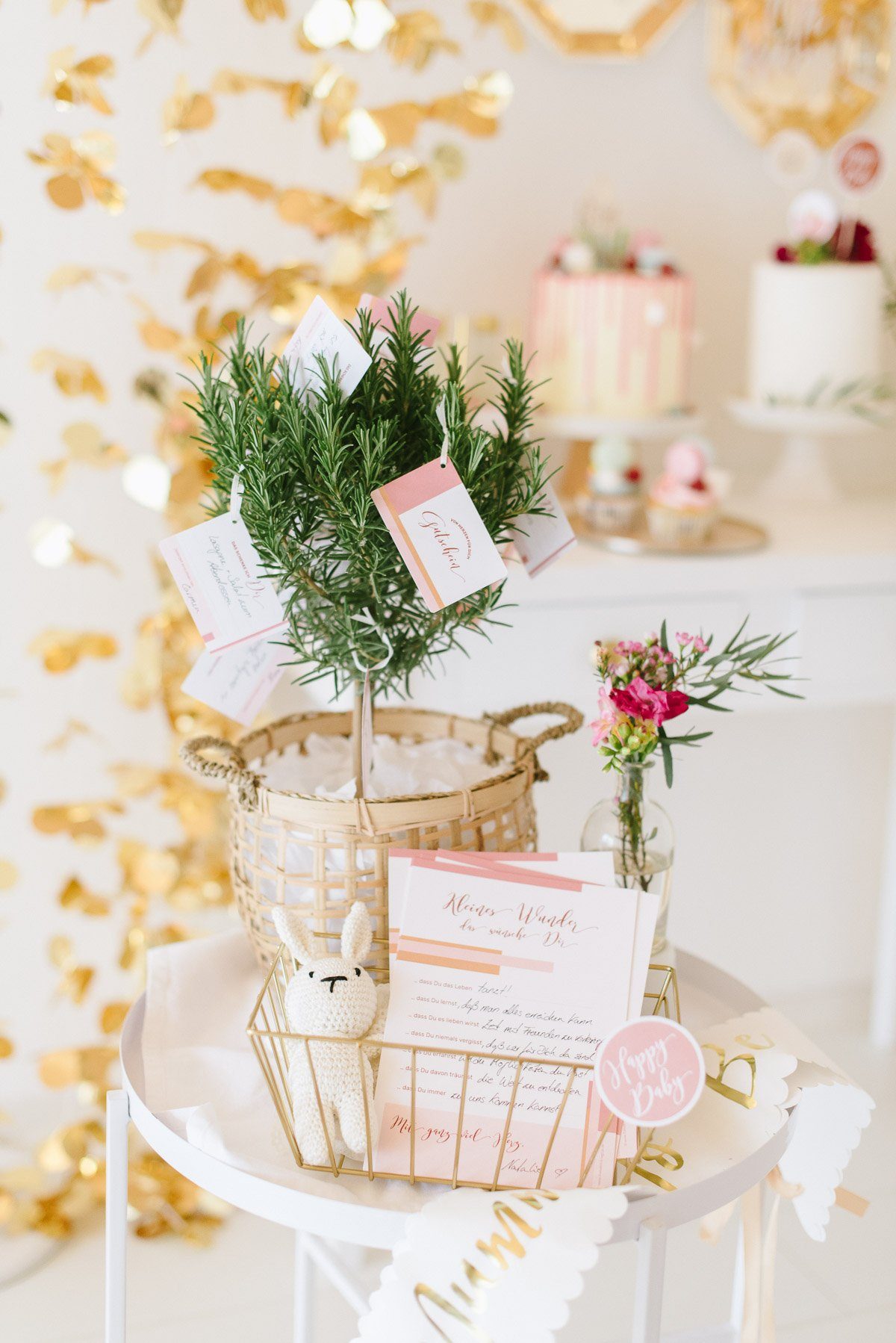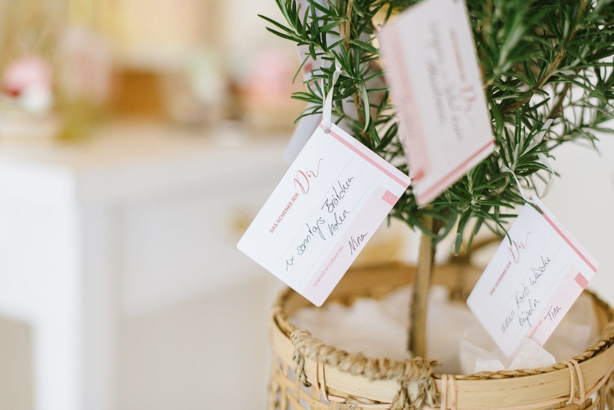 Um die ersten Wochen als Familie zu erleichtern überraschen die Freundinnen sie zusätzlich mit einem Wunschbäumchen. An ihm hängen kleine Gutscheine, auf denen ganz praktische Dinge verschenkt werden: einen Korb Wäsche bügeln, Brötchenservice am Sonntag, ein Abendessen vorbei bringen, ein Frisörbesuch mit Babysitter… Gemeinsam schafft man alles!